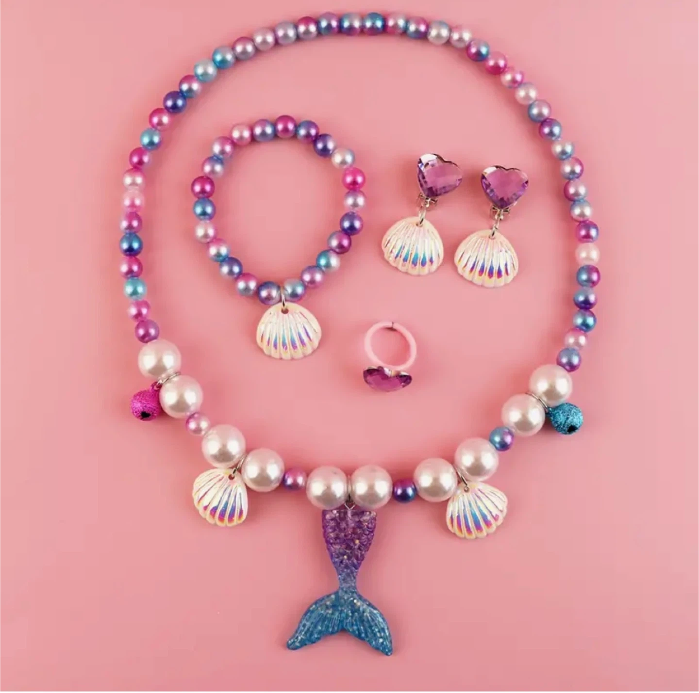 5Super cute mermaid-themed jewellery set! Includes a necklace, bracelet, earrings, and a ring. Perfect for dress-up or just adding a bit of sparkle to any outfit