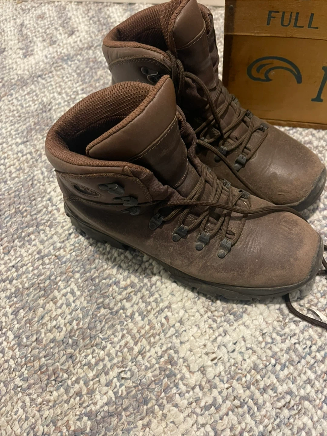 Selling a pair of Merrell hiking boots! They are brown leather and are in good condition. The soles are Vibram. No rips in leather or interior. I have walked through streams with these boots and never got a soaker.