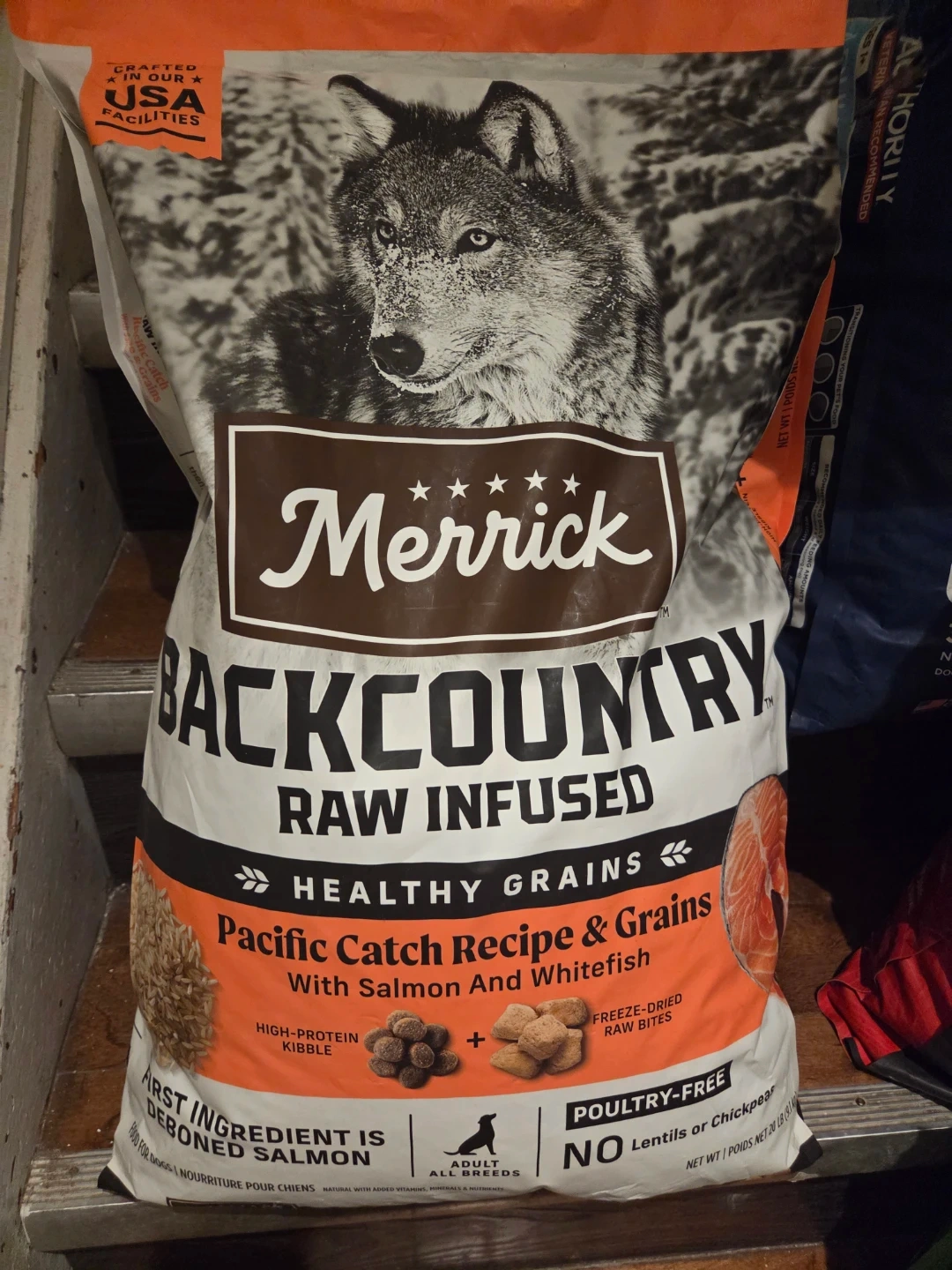 29Selling a 20 lb bag of Merrick Backcountry Raw Infused Pacific Catch Recipe & Grains dog food! It's a great option for adult dogs of all breeds. The first ingredient is deboned salmon, and it's poultry-free, with no lentils or chickpeas.