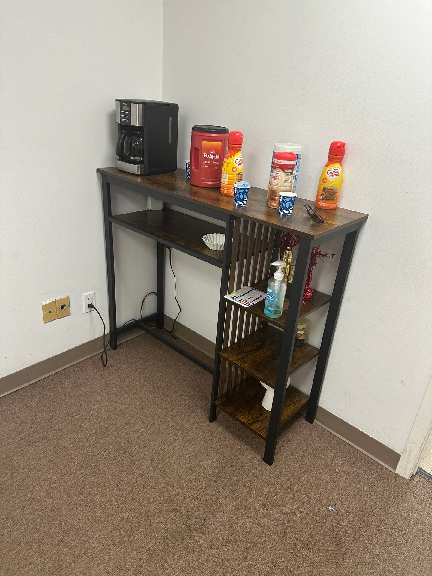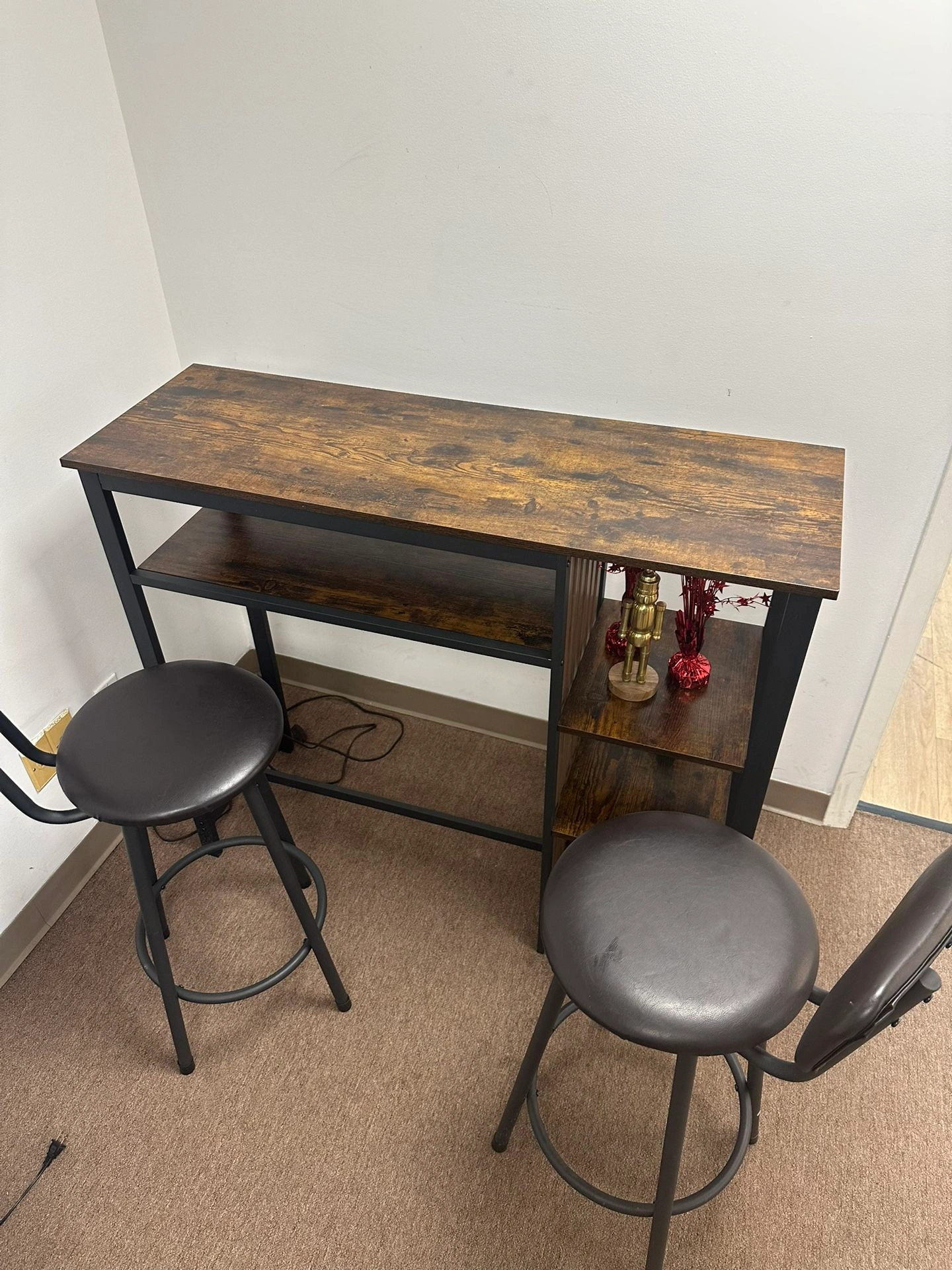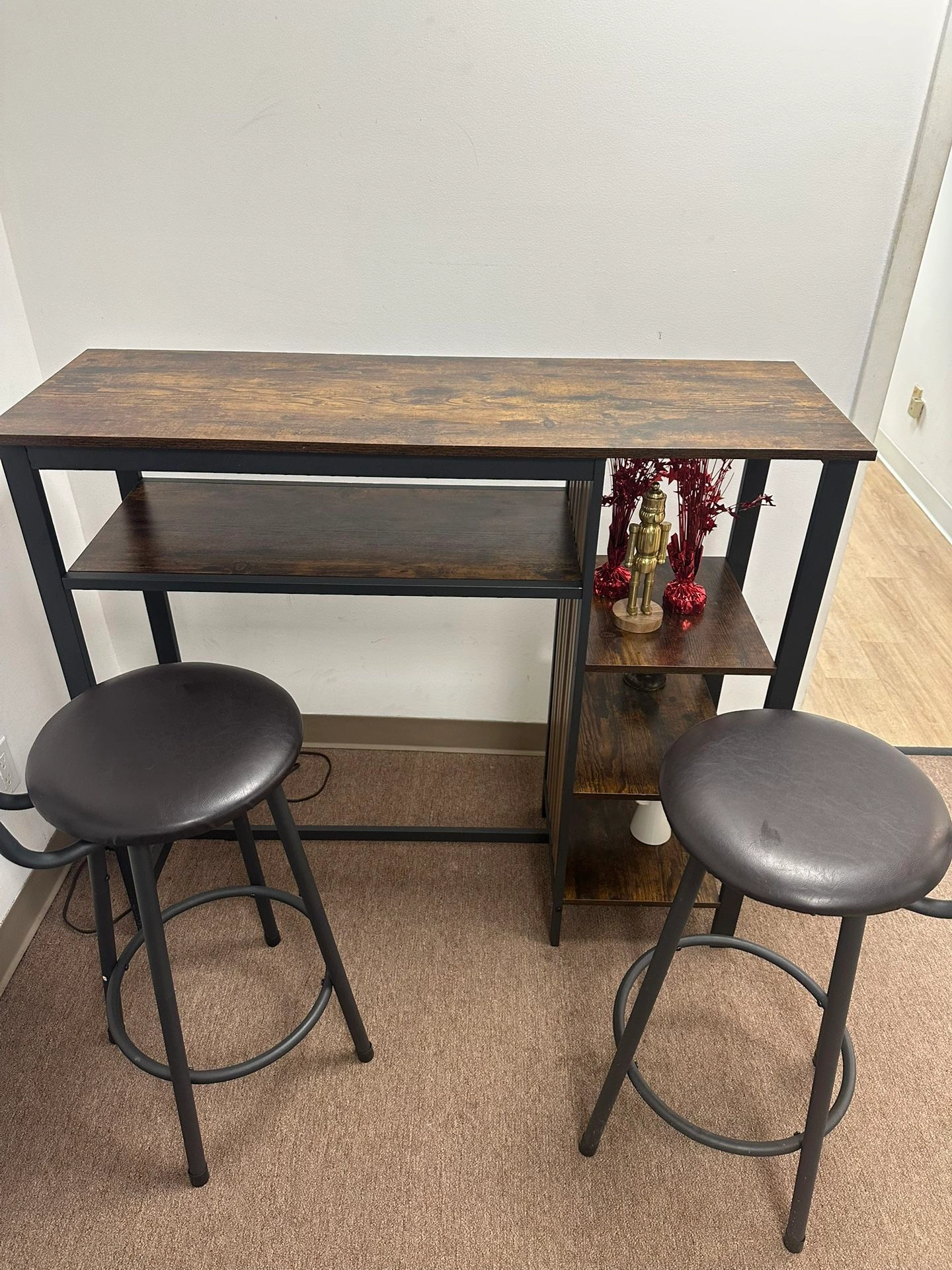 65High table with 2 chairs in a modern industrial style. Dark wood table with black metal frame and 2 comfortable high chairs. Very sturdy and in excellent condition. Details: • Durable wood and black metal frame • Includes 2 high padded chairs • With side shelves for decoration or storage • Perfect for breakfast, coffee, or working in style • In excellent condition, barely used Color: Wood
