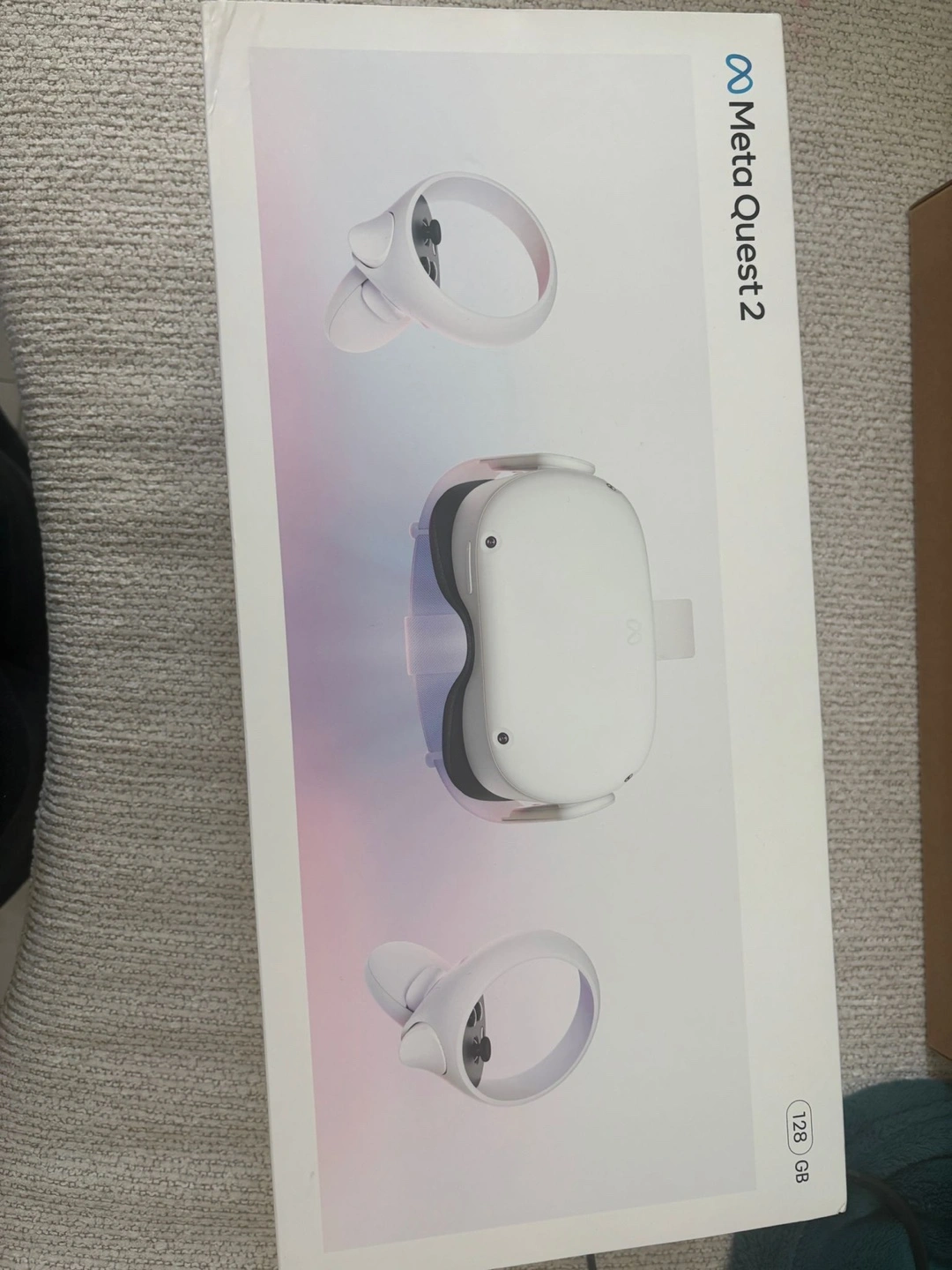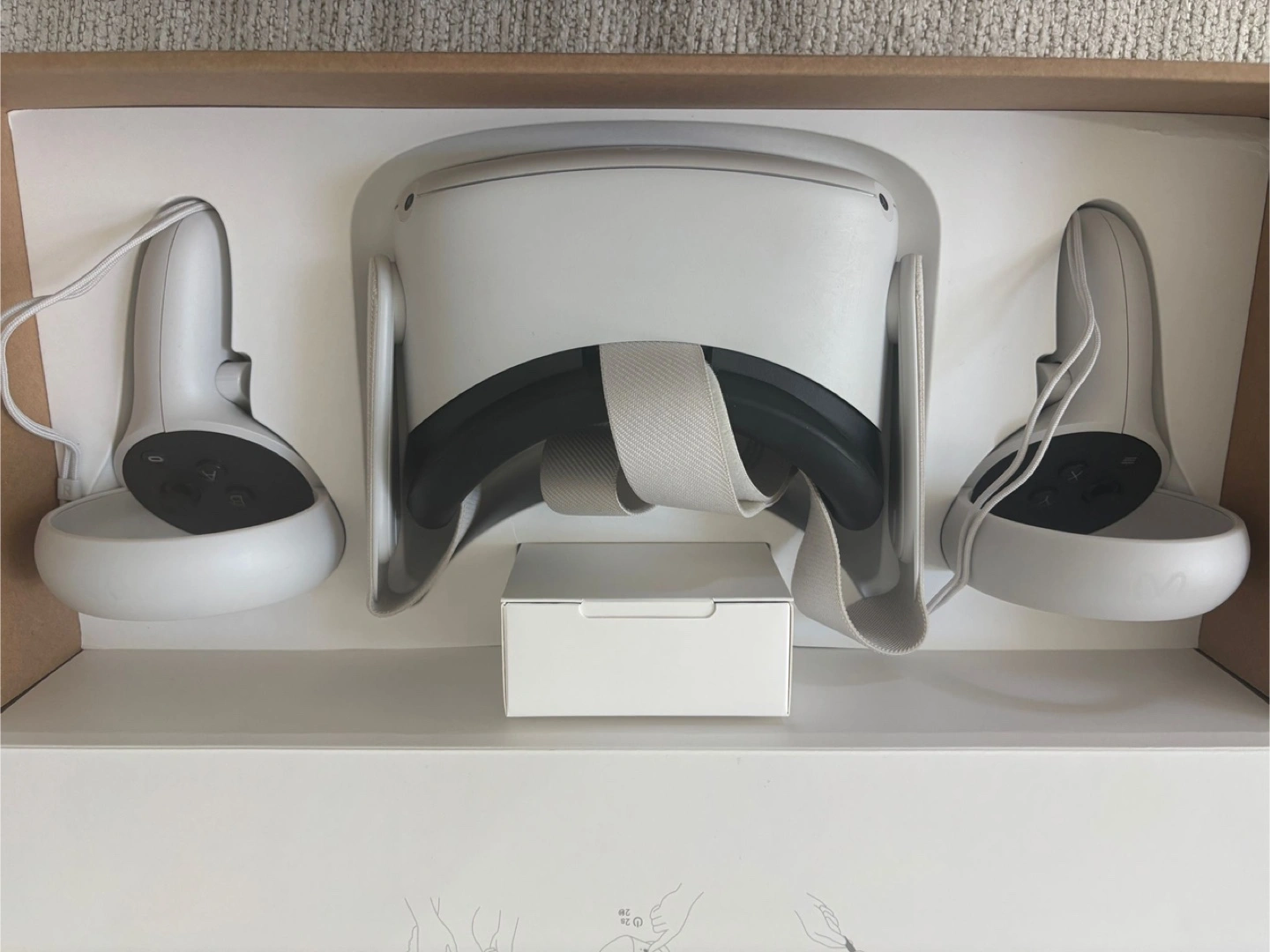 Freshly boxed VR headset, ready for new adventures. Includes a headset, controllers and other accessories. It is a great way to relax after a long day.