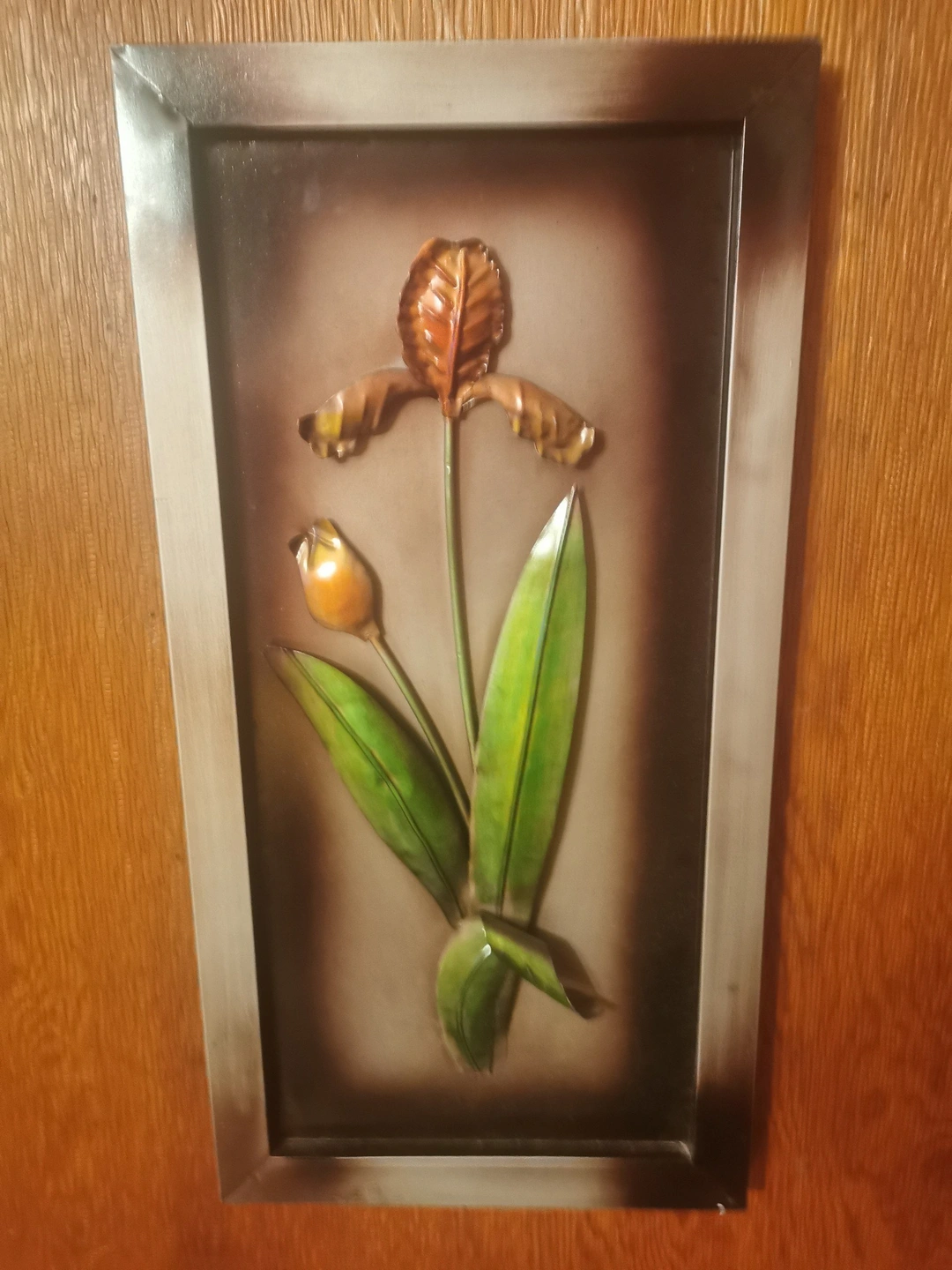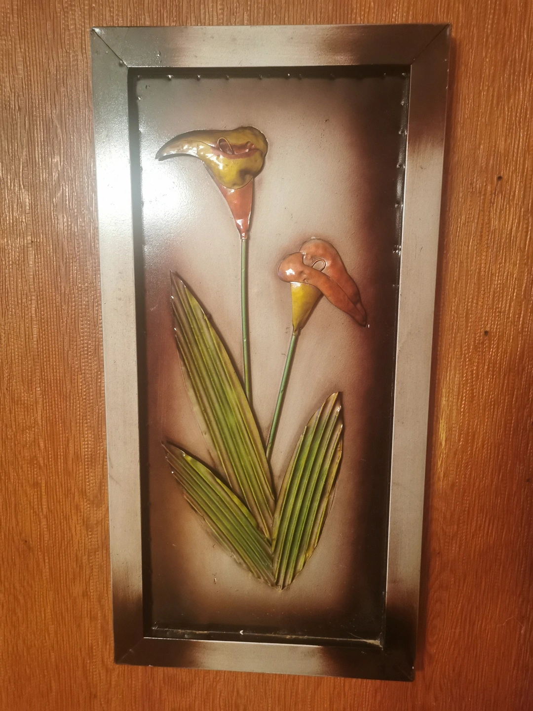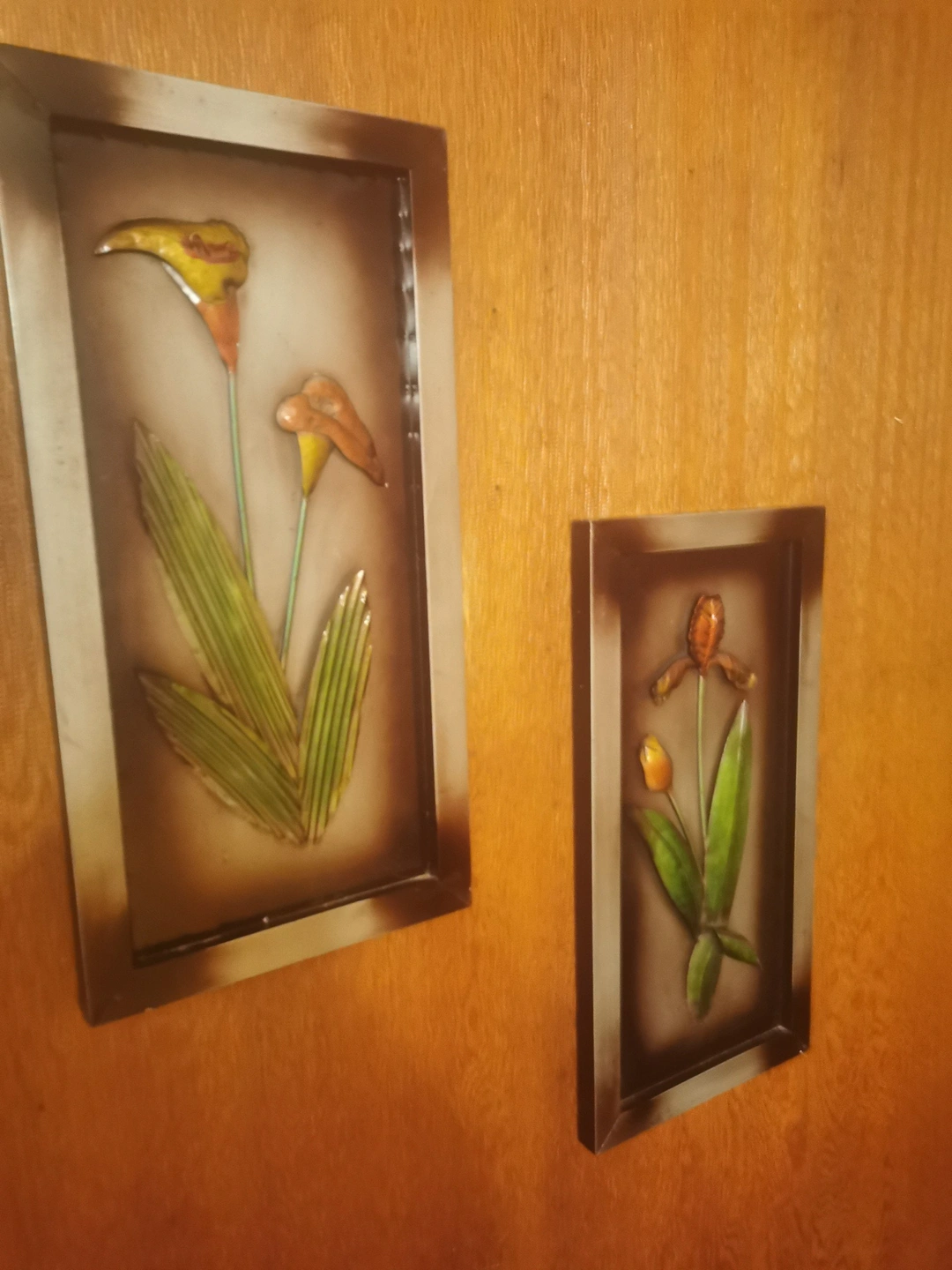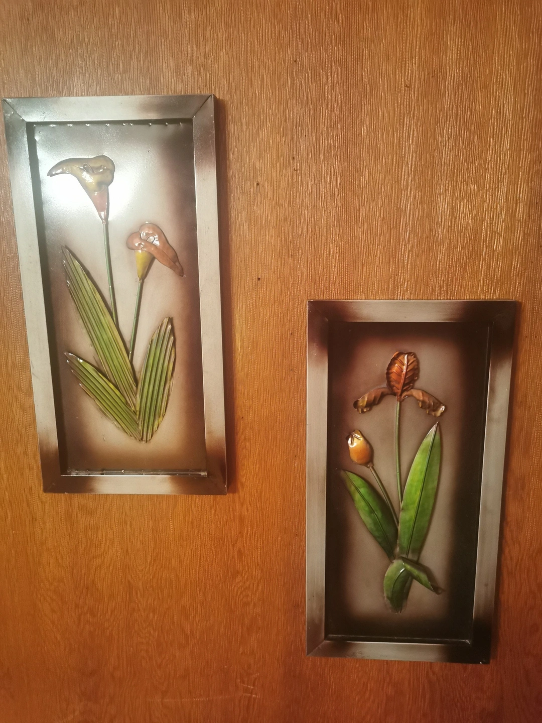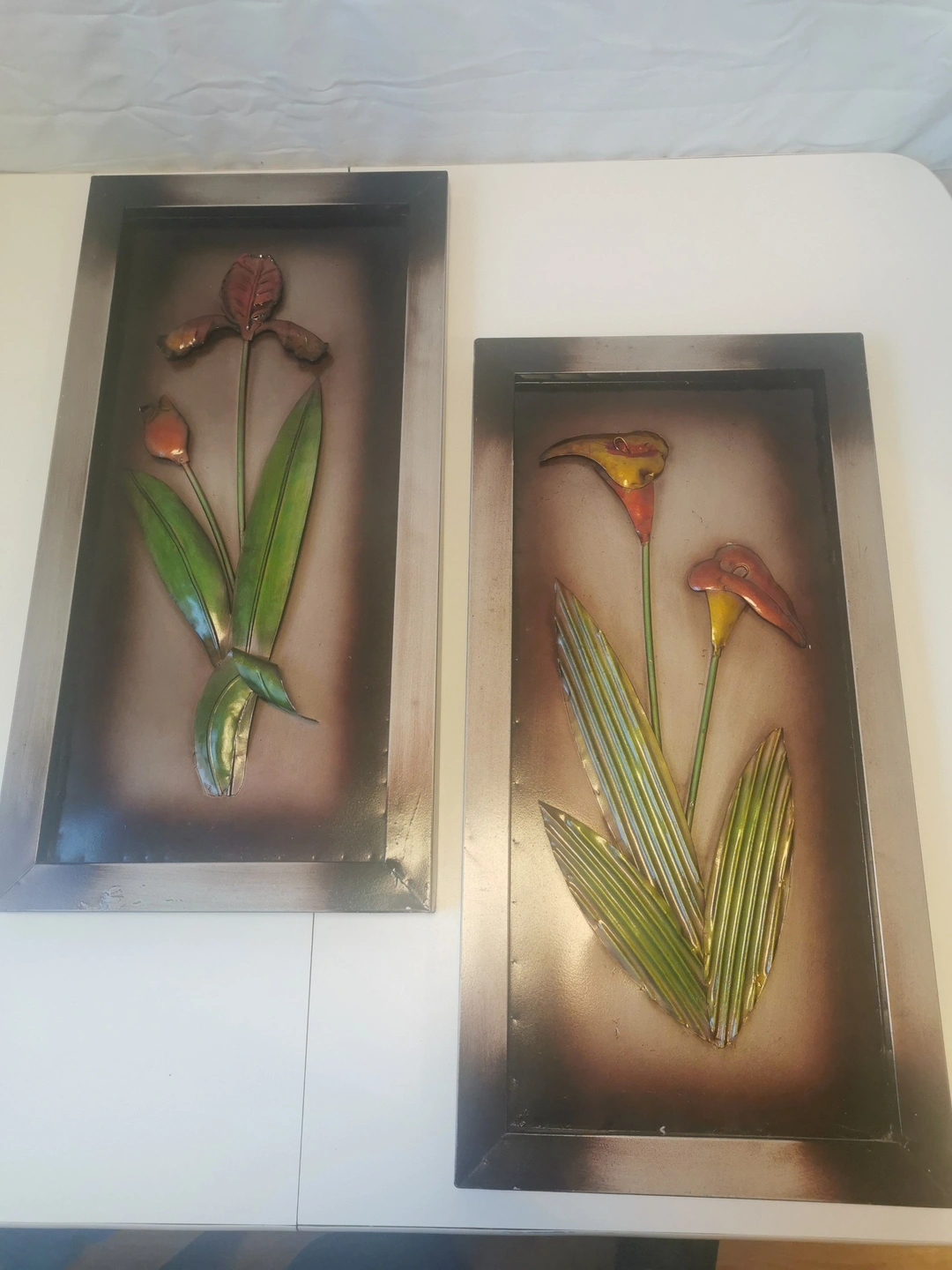 The Pair of Vintage Metal Art Pieces are a set of decorative collectibles made of metal, featuring a vintage style and multi-color design. These original art pieces are post-1940 in age and showcase intricate metalwork. Perfect for adding a touch of vintage charm to any space. Dimensions- Length 26 inches, Width 10.25 inches, Height 1 inch Condition: Good vintage condition light wear please reference photos as part of the description.