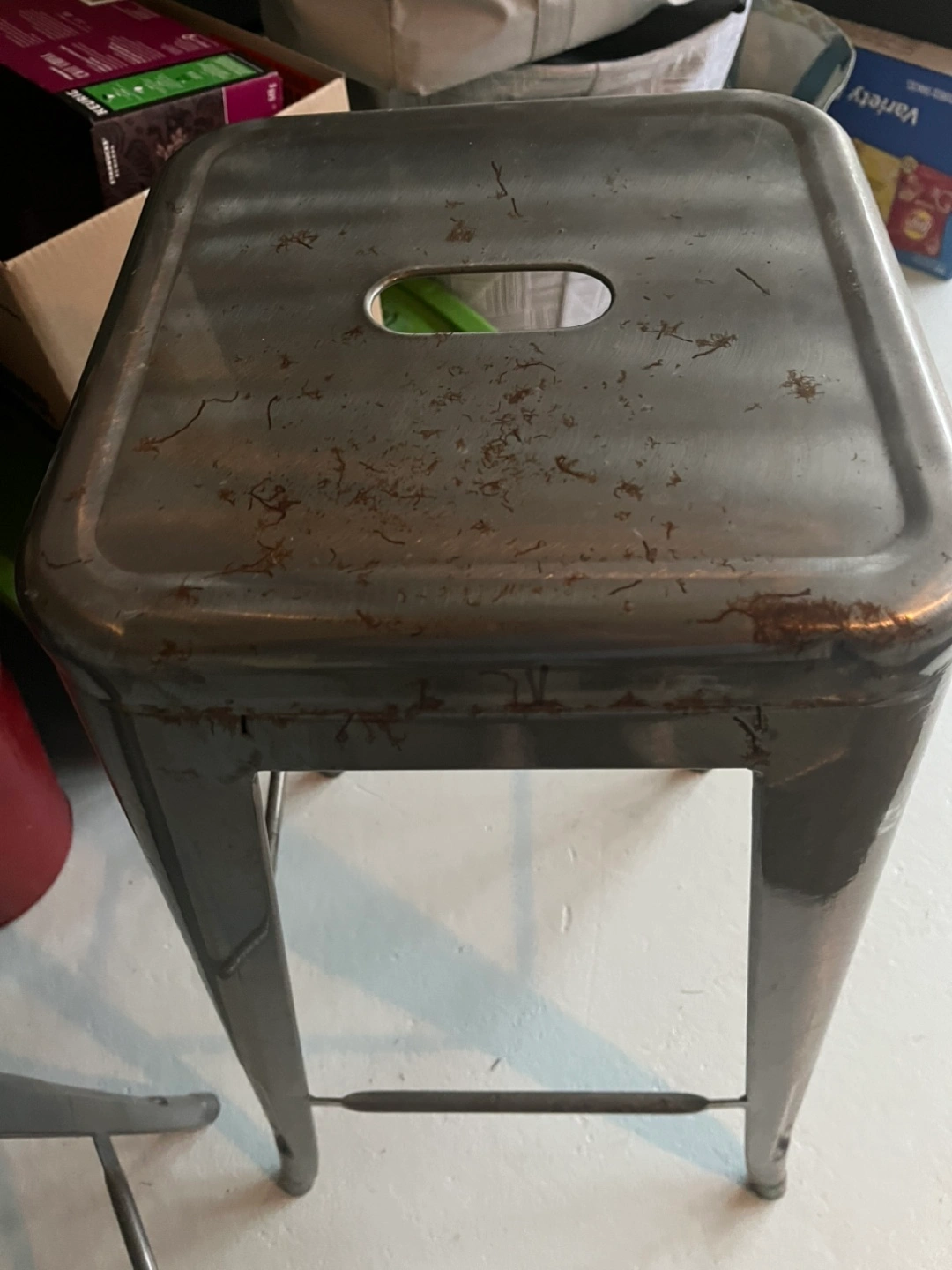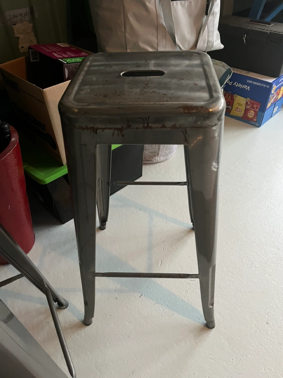 93Selling a metal bar stool in an industrial style! It's a sturdy stool that would look great in a kitchen or bar area. The stool has a square seat with a hole in the middle and a footrest for comfort. It has some signs of wear.