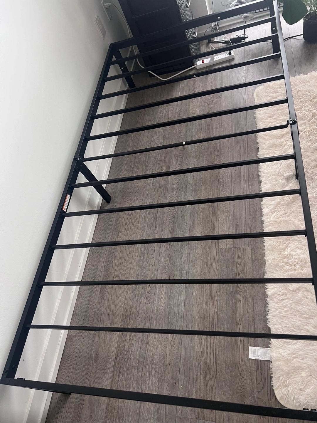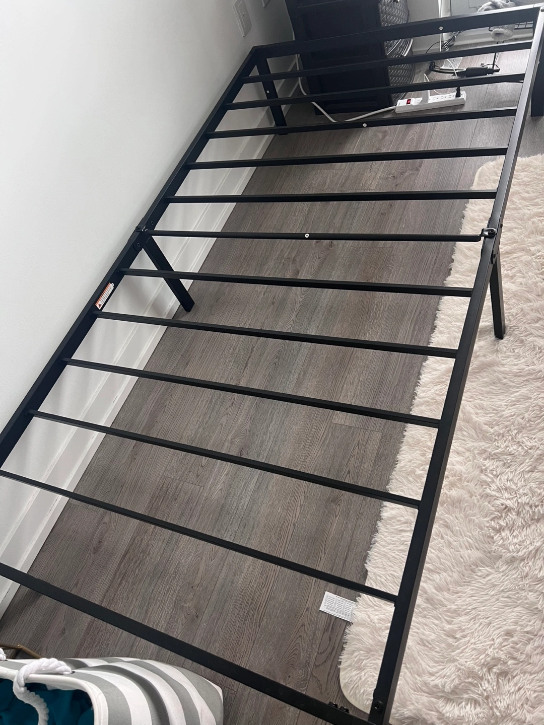 40Black metal bed frame. Rectangular shape with multiple horizontal bars. Perfect for a restful night's sleep, this bed frame will help you create a calming space for yourself. Please note: This does not include delivery Amazon- Rolanstar Bed Frame Twin Size, 14 Inch Metal Platform Single Bed Frame, Mattress Foundation with Heavy Duty Steel Slat Support, No Box Spring Needed, Easy Assembly, Black