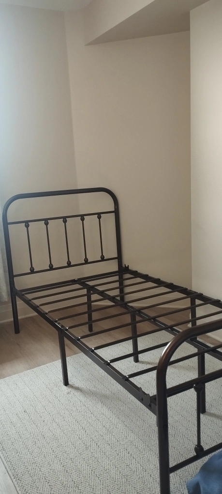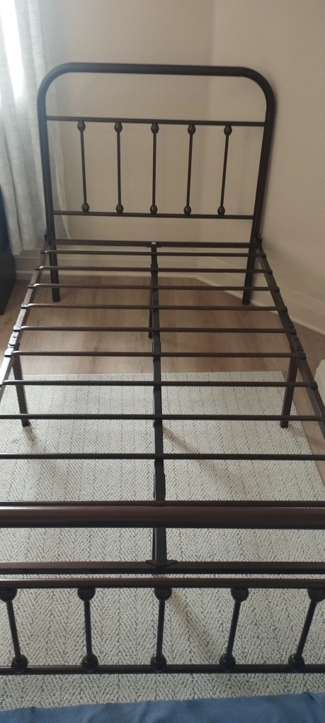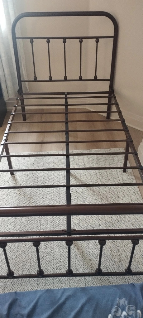 Selling a twin metal bed frame in brown. It's in good condition and ready for a new home. Perfect for a minimalist bedroom setup!