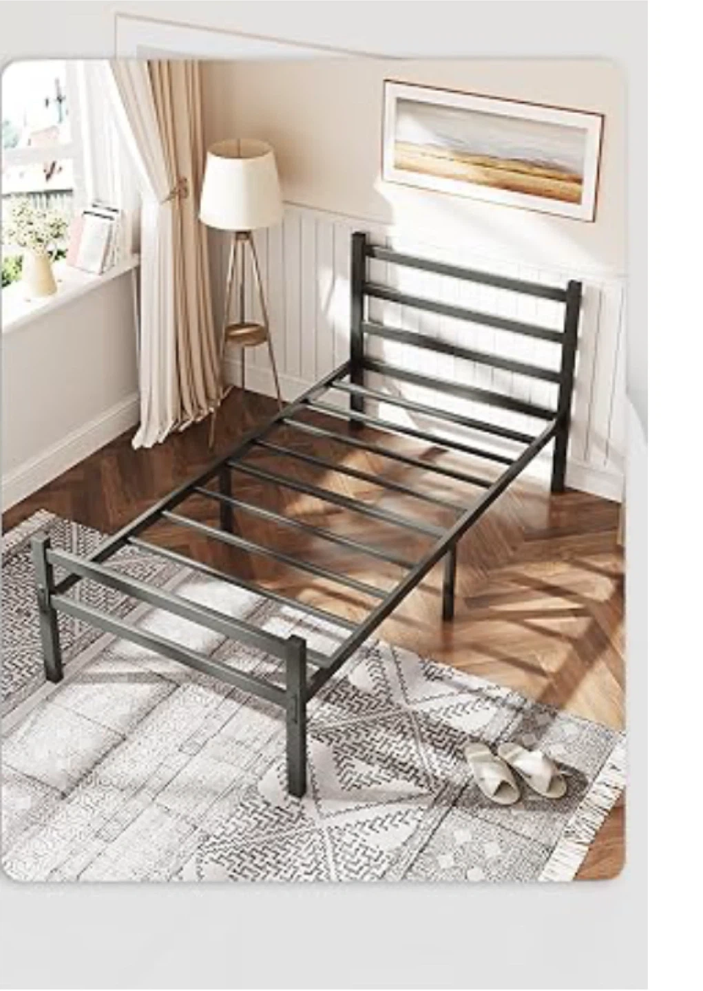 Selling a sturdy metal bed frame, perfect for a twin-size bed. It's in great shape and comes with all the necessary components for easy assembly. The heavy-duty steel slats offer strong support, and all legs are equipped with head & foot pads to prevent scratches. The dimensions are 108 x 26 x 9.5 cm. Comes with the original box!
