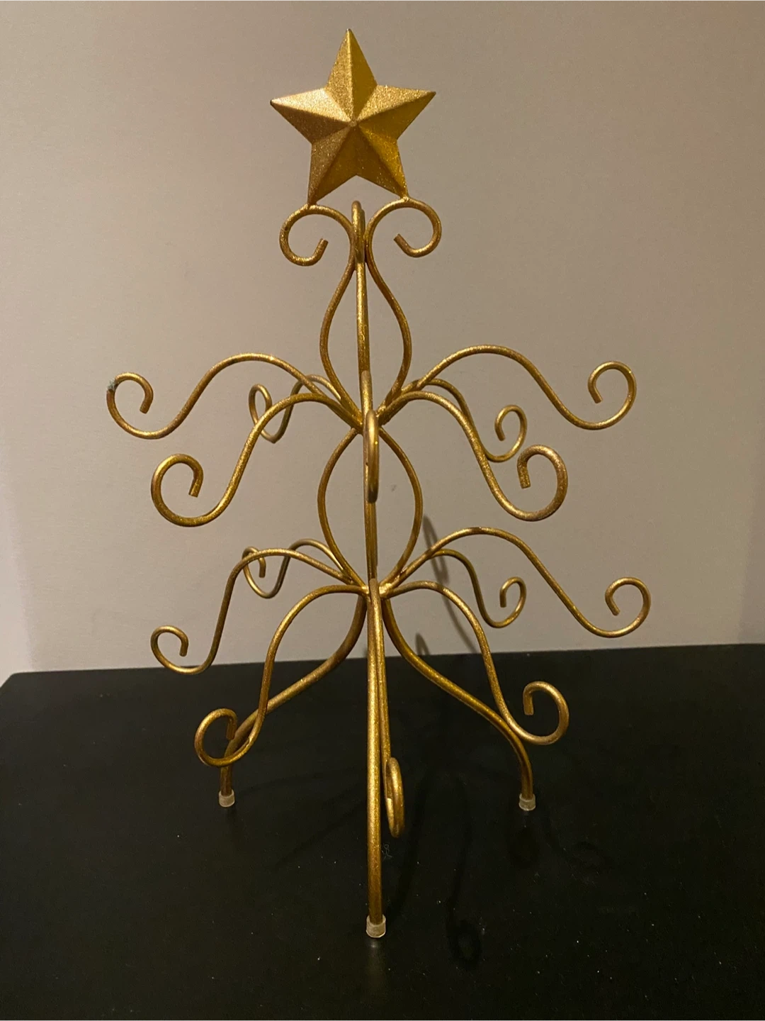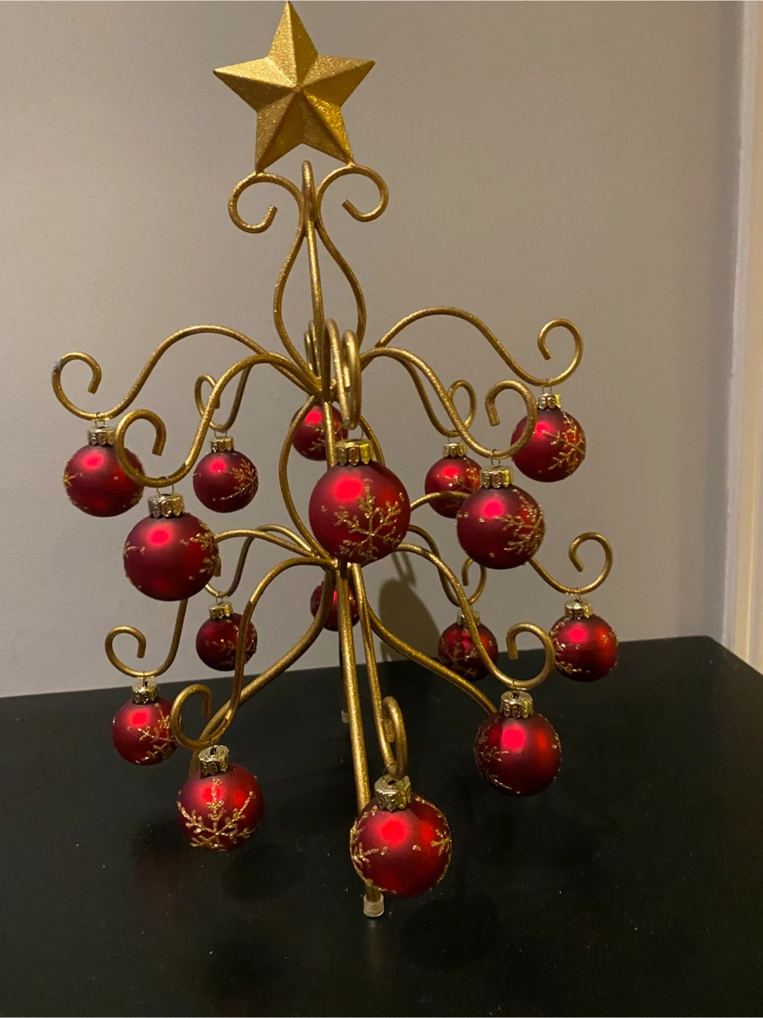 10This 22 inch tall gold coloured Christmas tree looks great as a centrepiece. Originally purchased from Pier One. Includes about 50 different ornaments which can be interchanged. Great for adding a festive touch to any room during the holidays