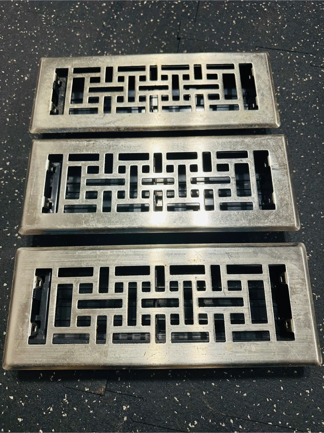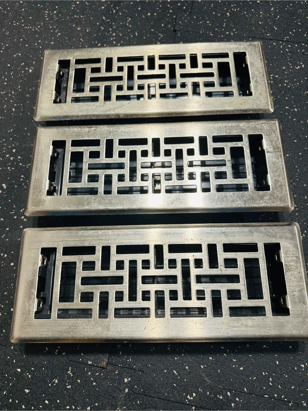 Selling a set of three metal floor registers. They have a unique geometric design and are in good condition. Perfect for adding a touch of style to your home!