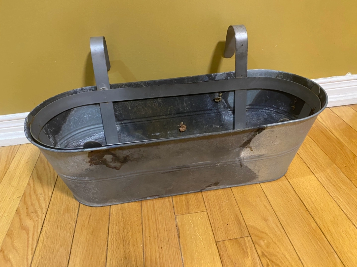 Oval shaped galvanized metal planter. Features metal hanging brackets. Interior support structure. Shows some signs of wear.