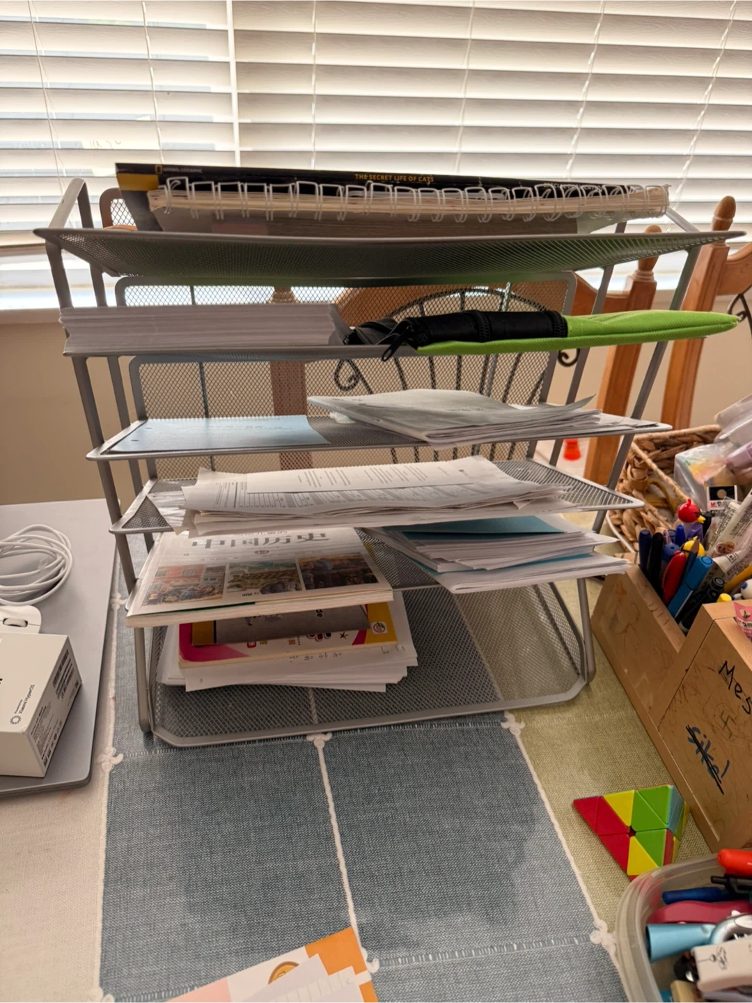 Declutter your space with this handy metal mesh document tray! It features three tiers, perfect for organizing papers, notebooks, and other office essentials. It's in great condition and ready to help you keep your workspace tidy