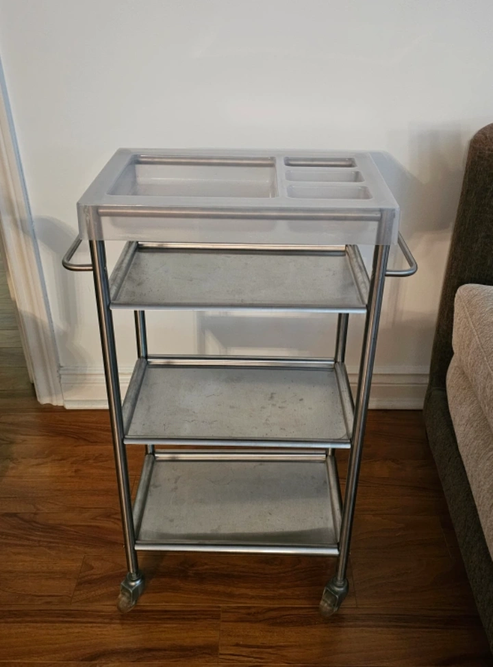 Here's a handy rolling cart with a metal frame and plastic top. It has three shelves, perfect for extra storage in the kitchen, bathroom, or anywhere you need a little more space! The wheels make it easy to move around
