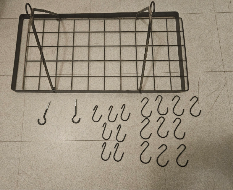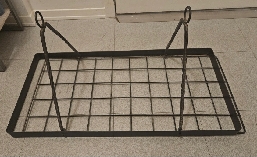 Selling a metal pot rack, perfect for organizing your kitchen! It comes with several hooks to hang your pots and pans. Great for saving space and adding a rustic touch to your kitchen