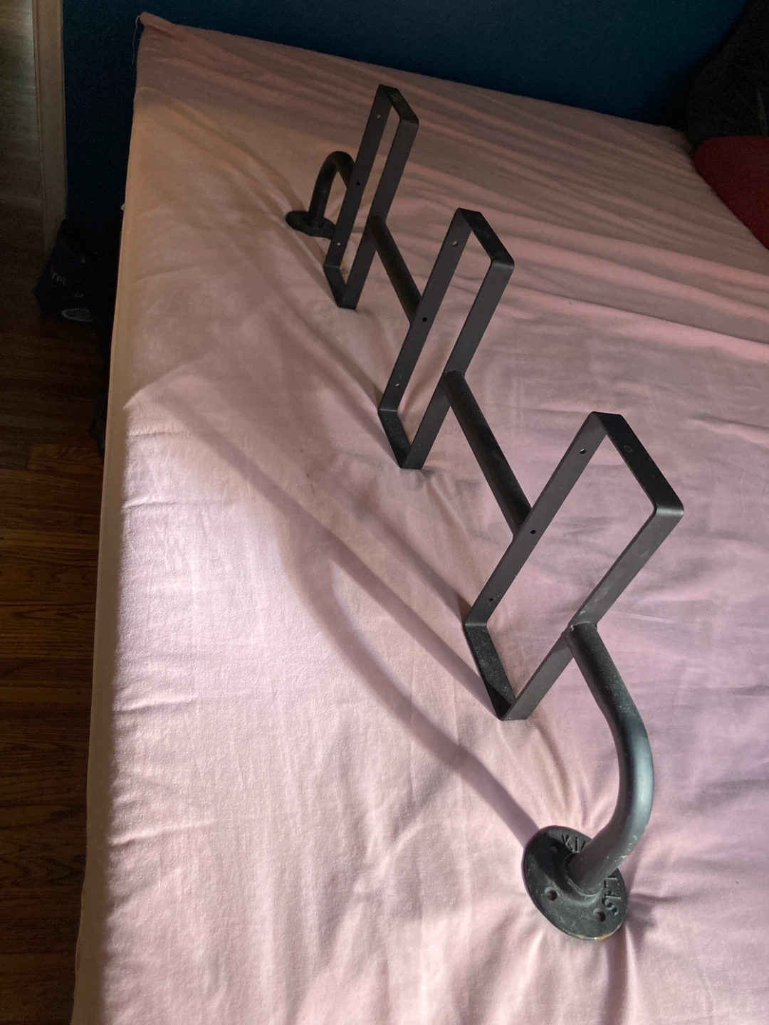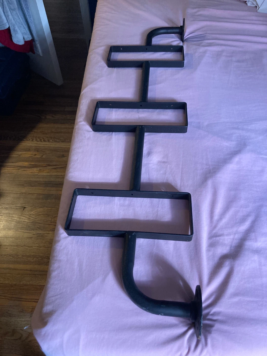 933Selling a metal rack/bracket. It's stylish and unique. The black metal finish gives it a modern look. Each round part has 4 holes to attach hardware. 44 inches x 12 inches