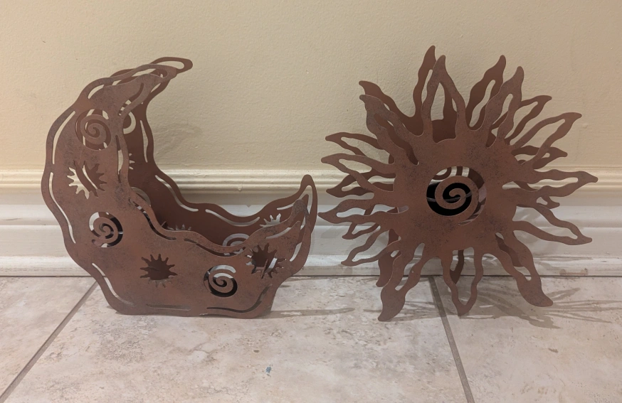 92I'm selling a set of metal sun and moon candle holders. They have a rustic, brown finish and would look great indoors or outdoors!