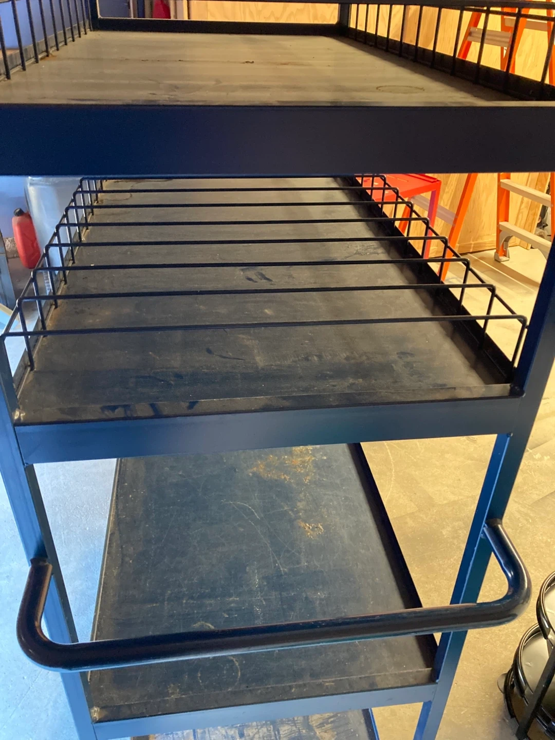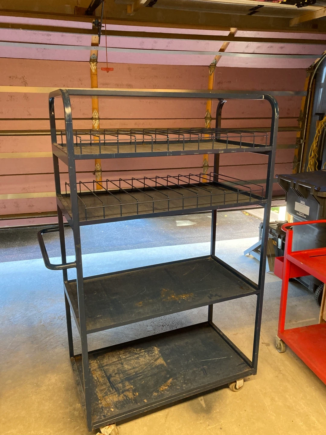 Here's a sturdy metal utility cart. It features multiple shelves, offering ample storage space. Perfect for organizing tools, supplies, or anything else you need to keep tidy in your garage or workspace