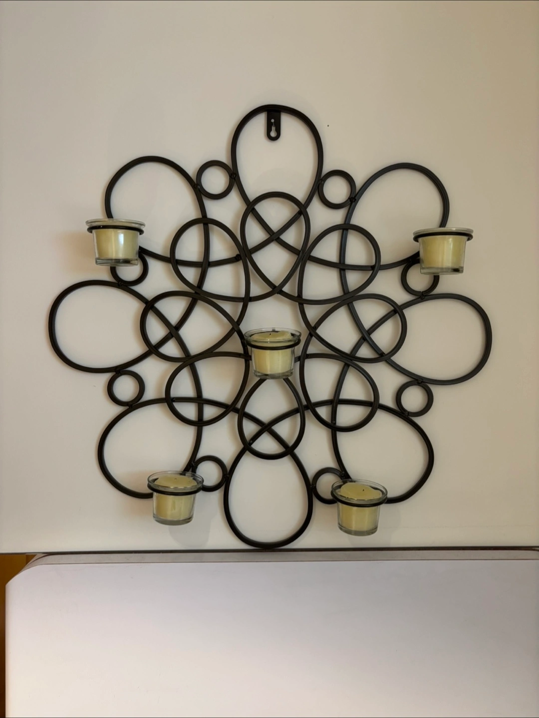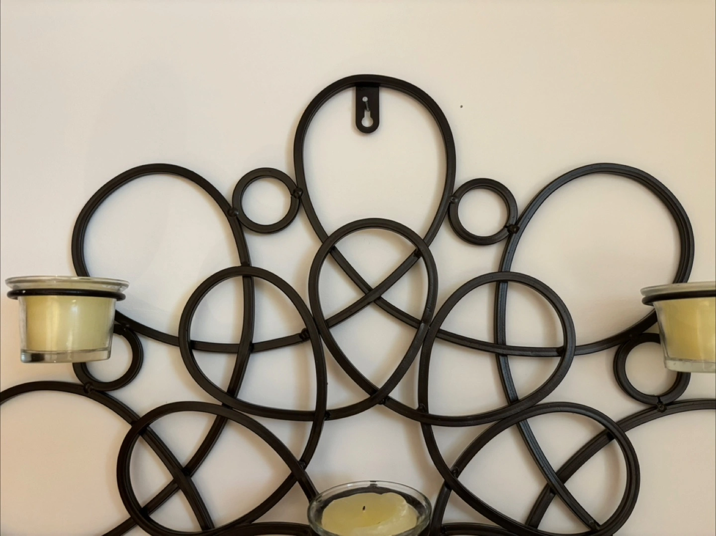 103Add a touch of warmth to your space with this unique metal wall candle holder! It features a decorative, swirling design and holds multiple tea light candles. Perfect for creating a cozy atmosphere in any room of your home