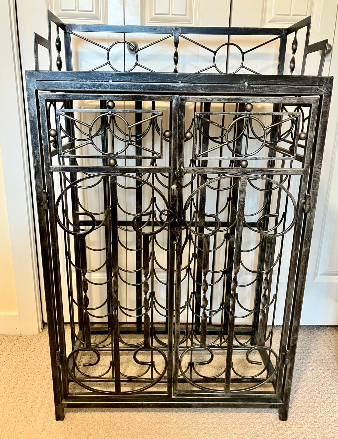 Selling a sturdy metal wine rack cabinet which can hold 35 regular sized bottles. The doors can be locked, preventing sneaky persons from messing with your stash. Don’t delay, upgrade your rack today!!