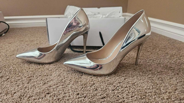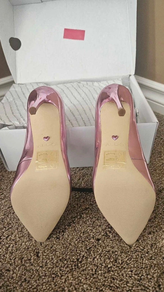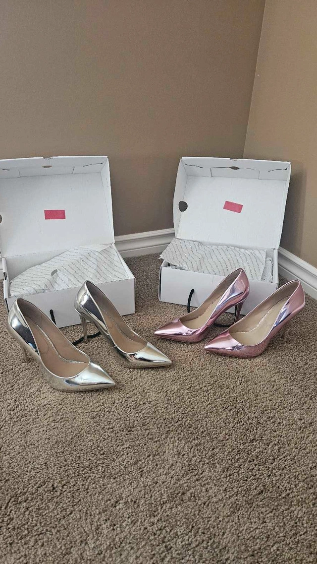 Silver or Pink metallic heels. From Aldo, pink shoes never worn, silver worn twice. Size 6.5 US. Ideal for that upcoming Christmas party. $30 per pair.