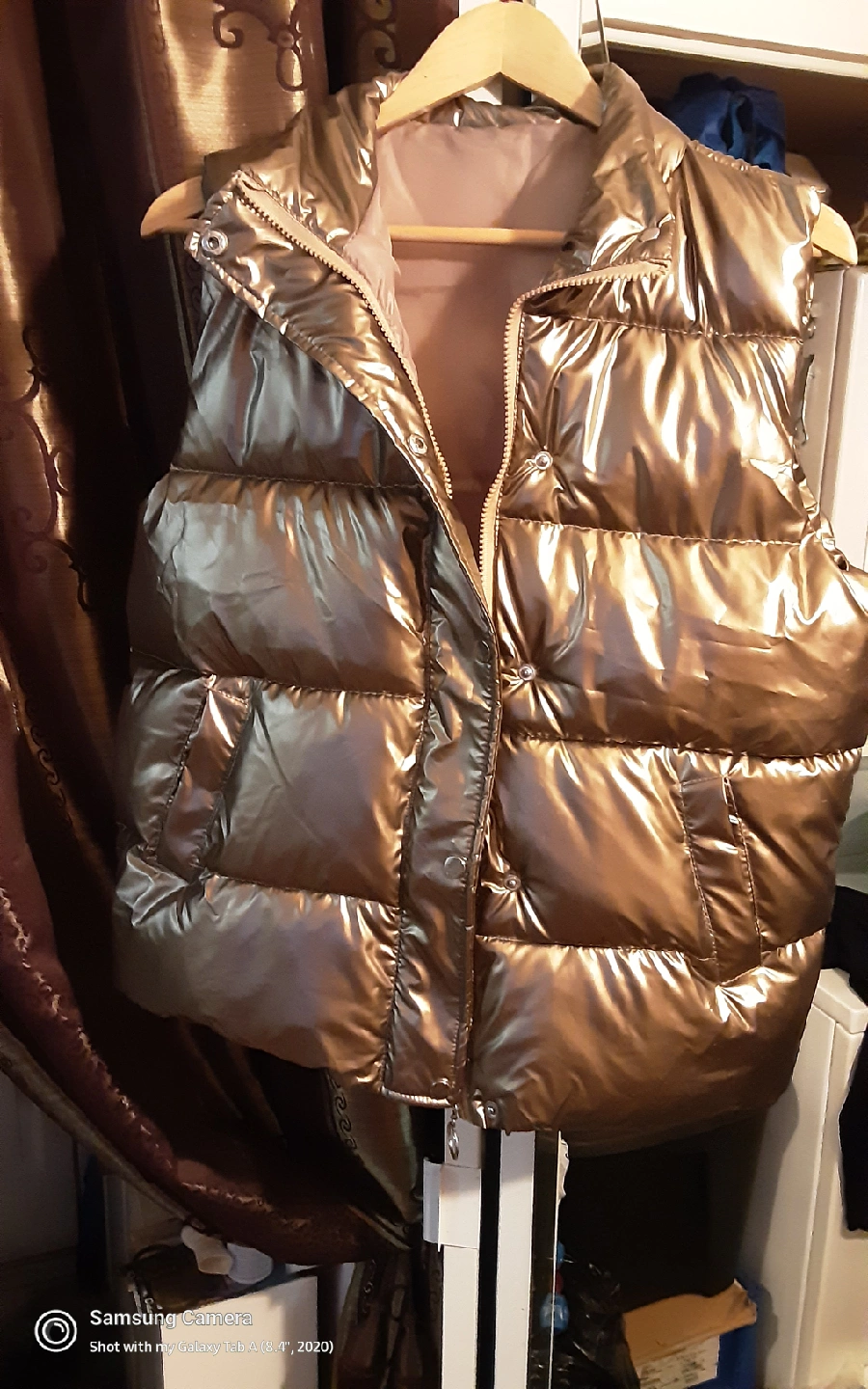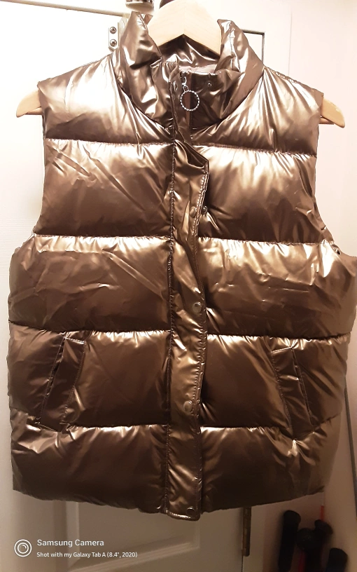 Selling a metallic gold puffer vest. It's in great condition and perfect for layering during the cooler months! The vest features a shiny, eye-catching metallic gold finish and a comfortable, padded design.