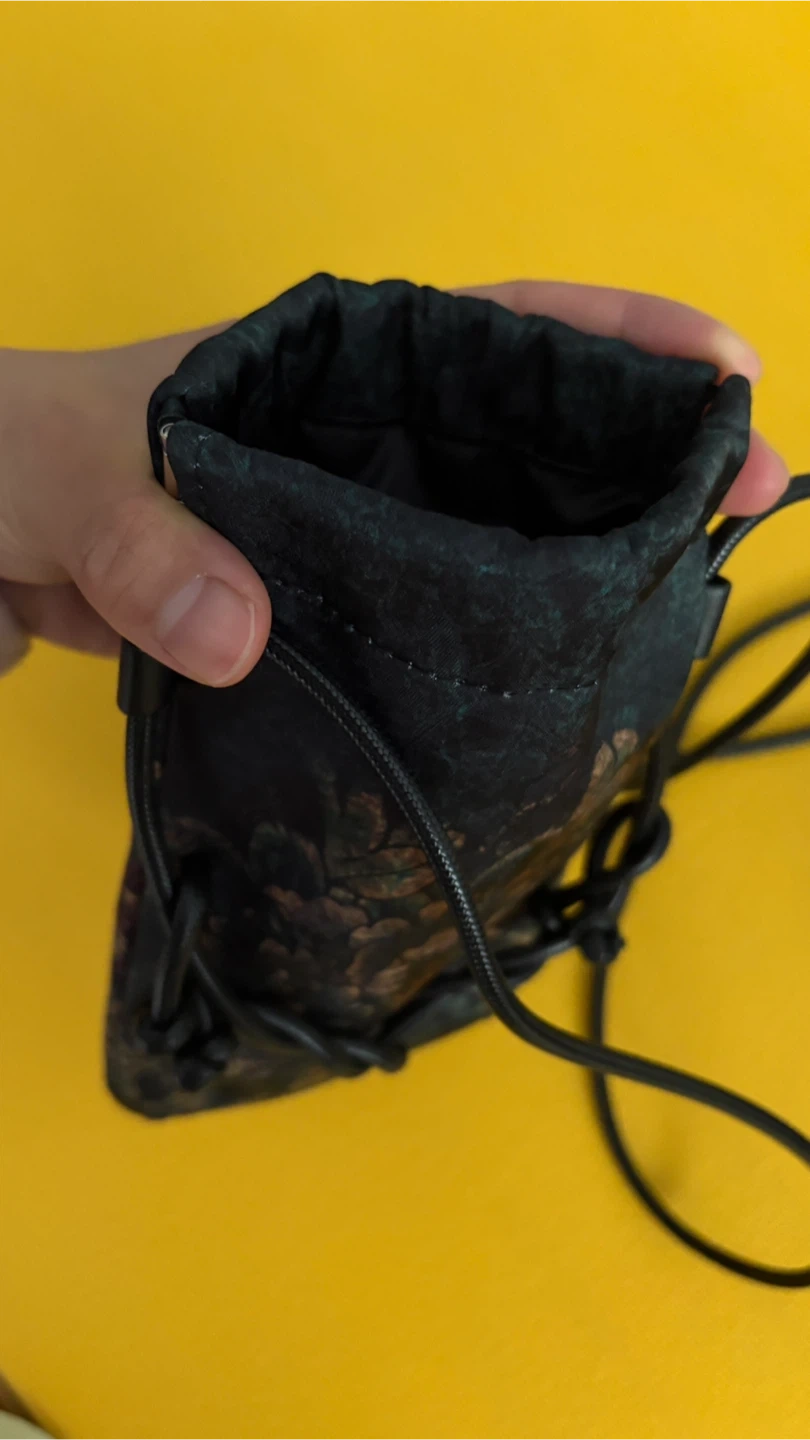 A small drawstring pouch with a dark floral print. It's perfect for storing small items like coins, phone, or earbuds. The durable fabric and secure drawstring closure keep your belongings safe.