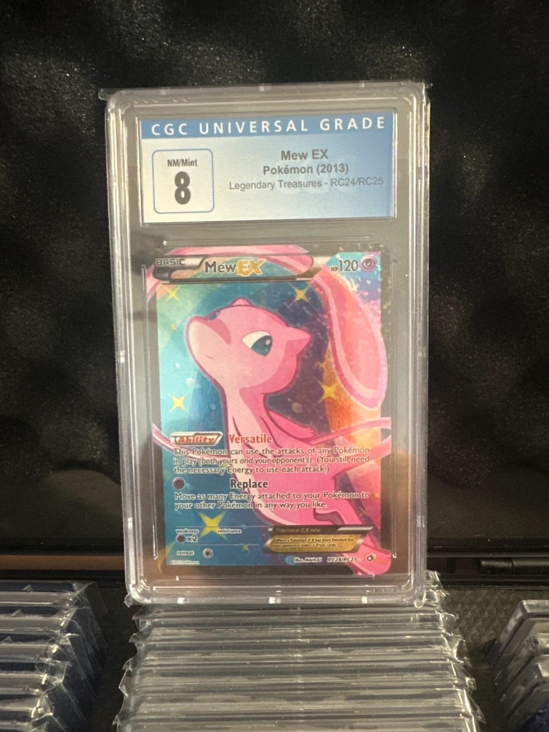 Selling a CGC Universal Grade NM/Mint 8 Mew EX Pokemon card from the 2013 Legendary Treasures series (RC24/RC25)
