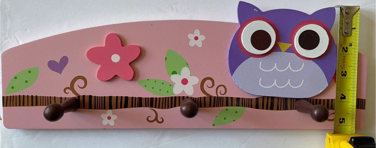 103Brand New Cute owl-themed wall hook rack, perfect for a kid's room or nursery! It's pink with purple accents and has four hooks for hanging items. It’s from smoke free clean house.