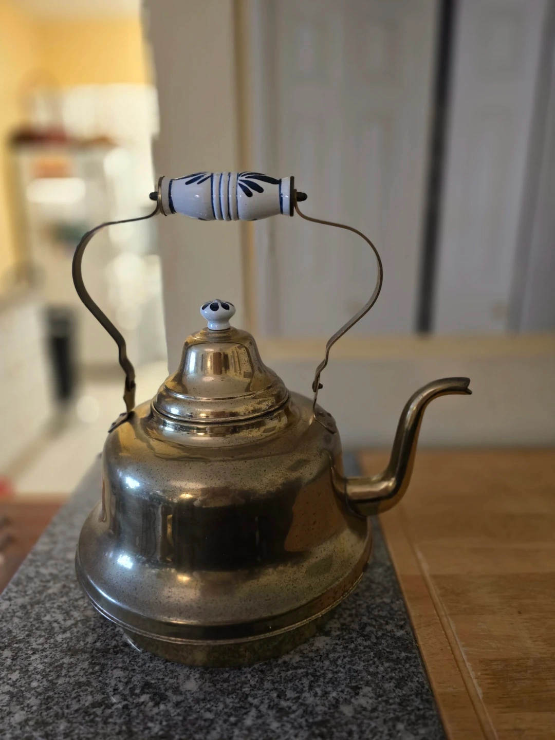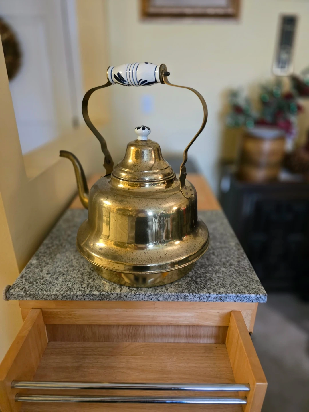 A beautiful brass kettle with a decorative ceramic handle. This kettle has a classic design and a shiny finish. It may be used for boiling water. I have used it as a decorative accent in the kitchen. It may also be used as a planter.
