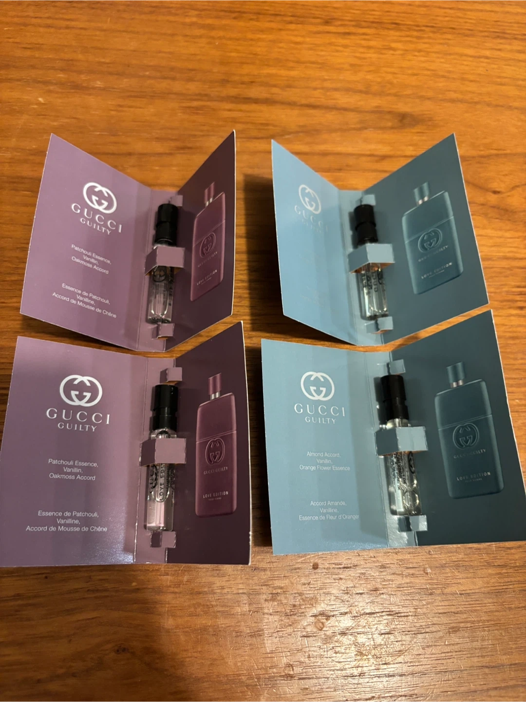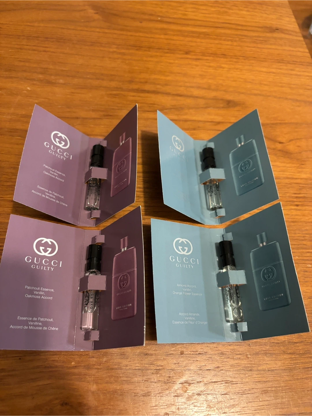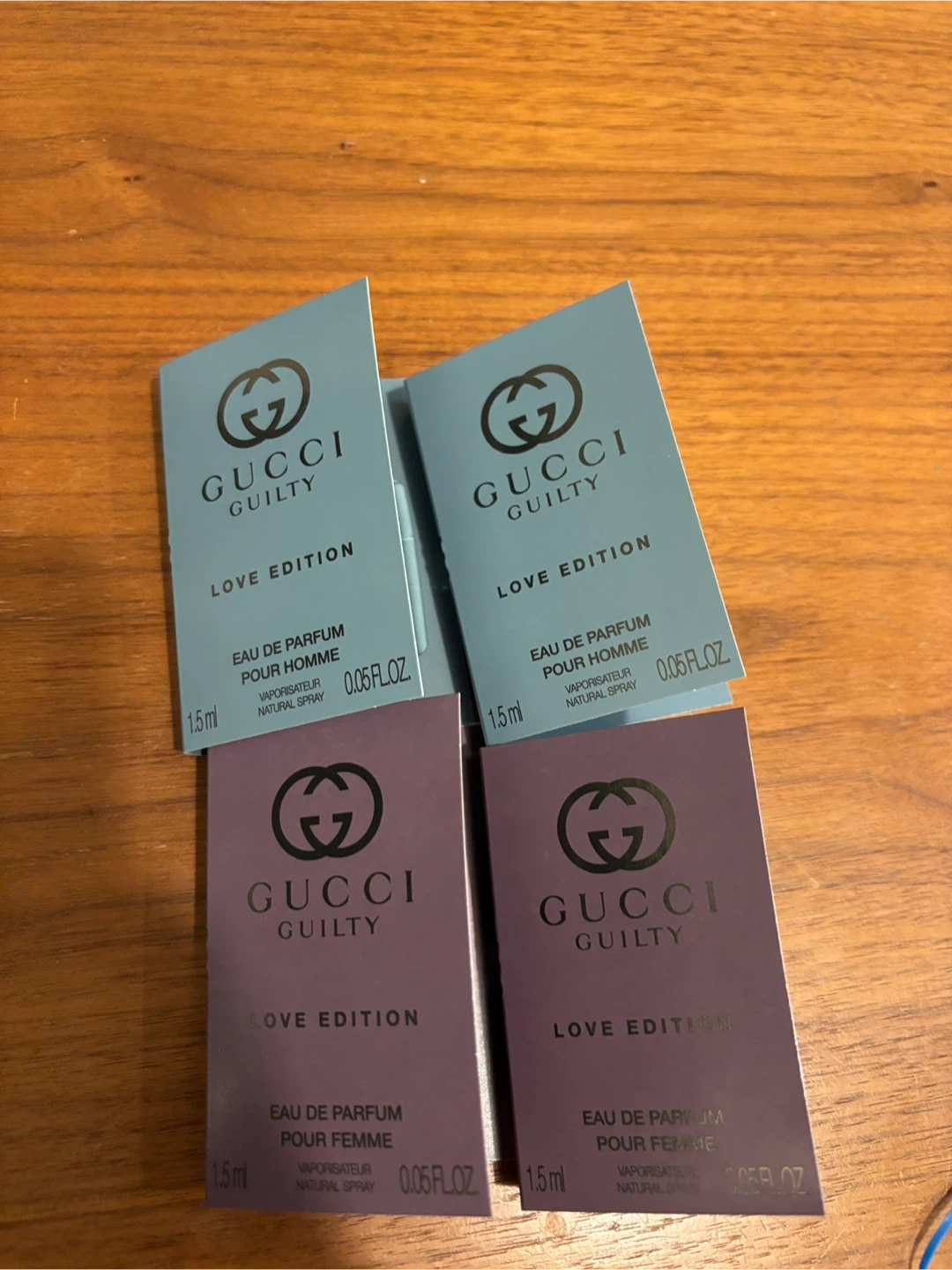 Includes two Gucci Guilty Love Edition for women and two for men fragrance samples. Each vial is 1.5ml, or 0.05 fl. oz. These are great for trying out before buying a full size bottle!