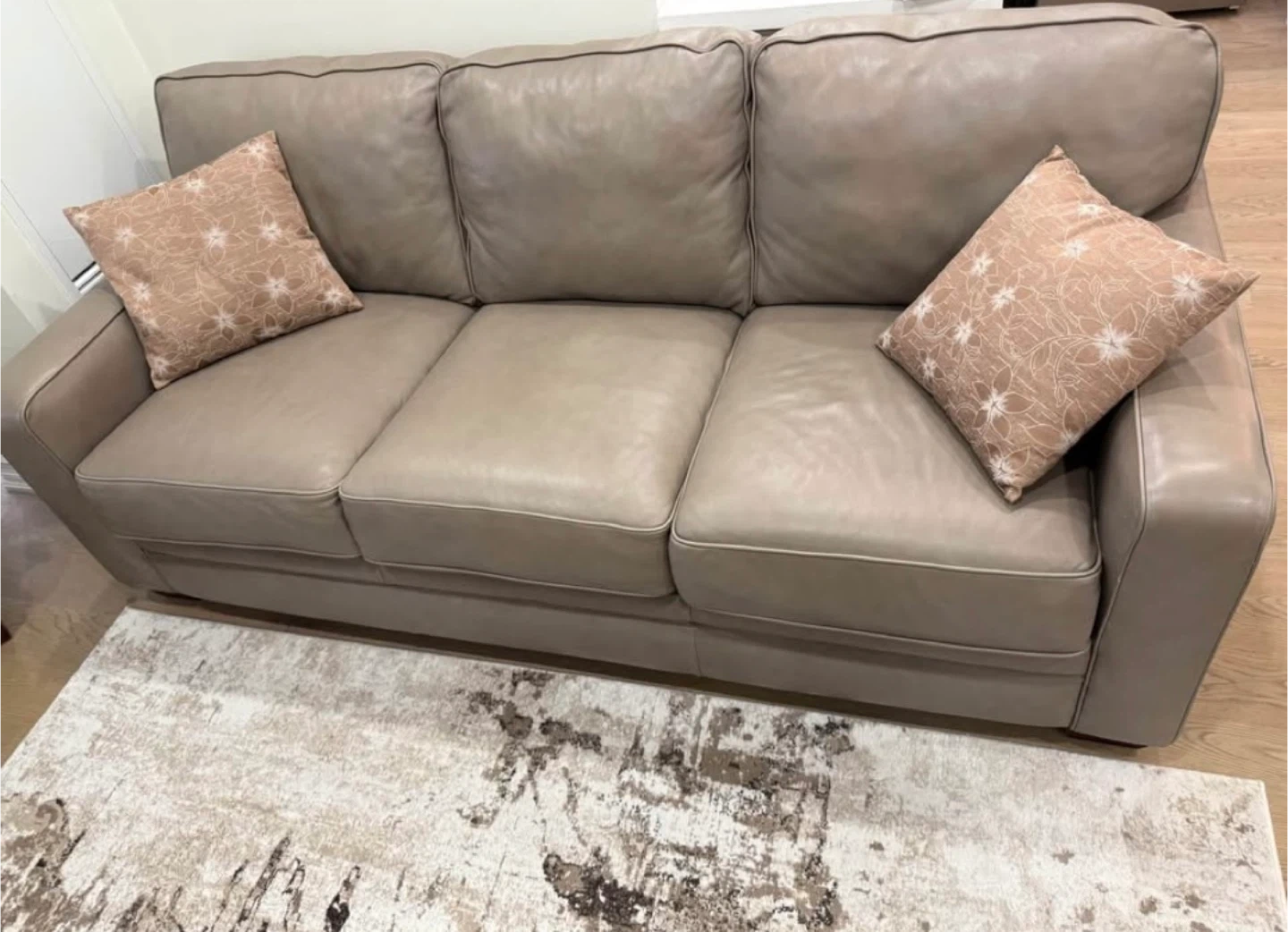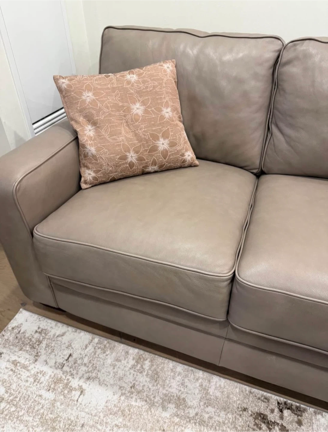10Selling a comfy leather sofa that's in great shape! It's a neutral beige-grey colour that would fit well in any living room. Comes with two matching throw pillows to complete the look