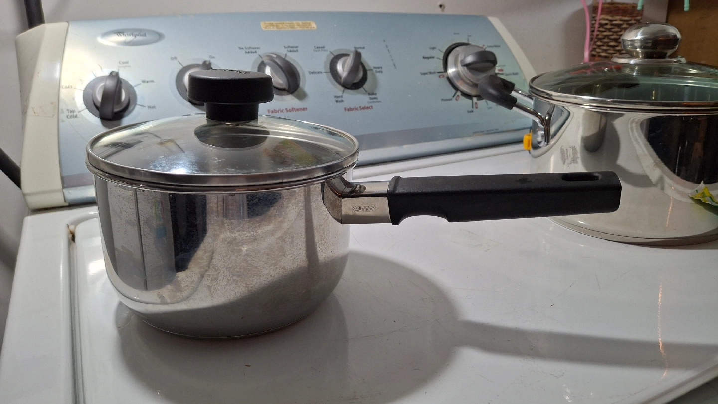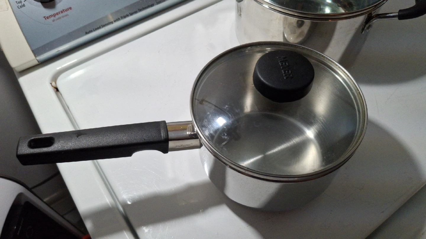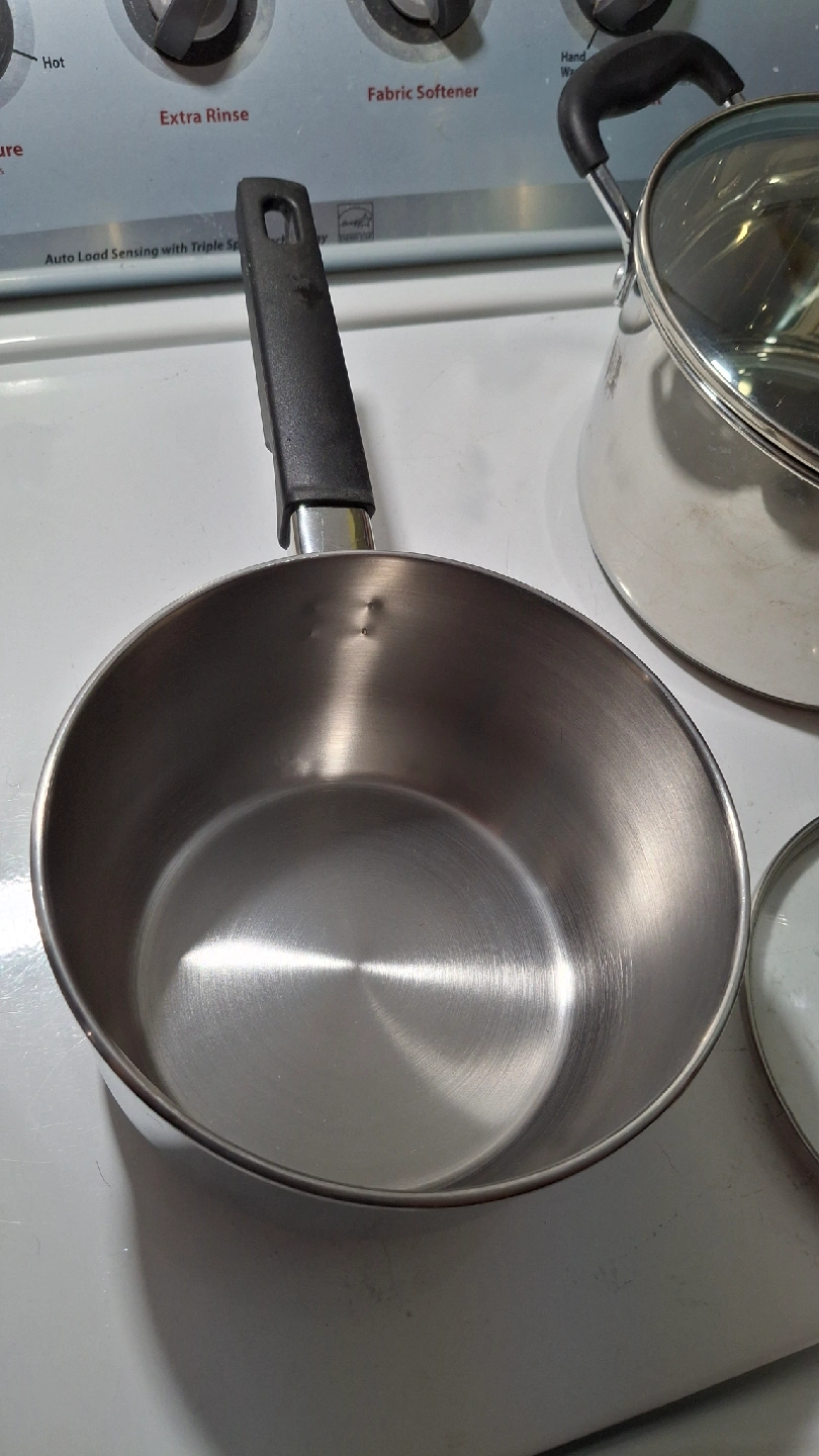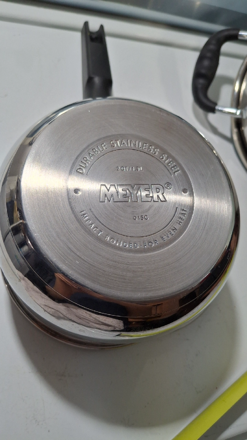 Meyer 2QT/1.9L durable stainless steel saucepan. It's impact bonded for even heat. Great for cooking up a quick meal! 6.5" diameter 4" height 6" handle