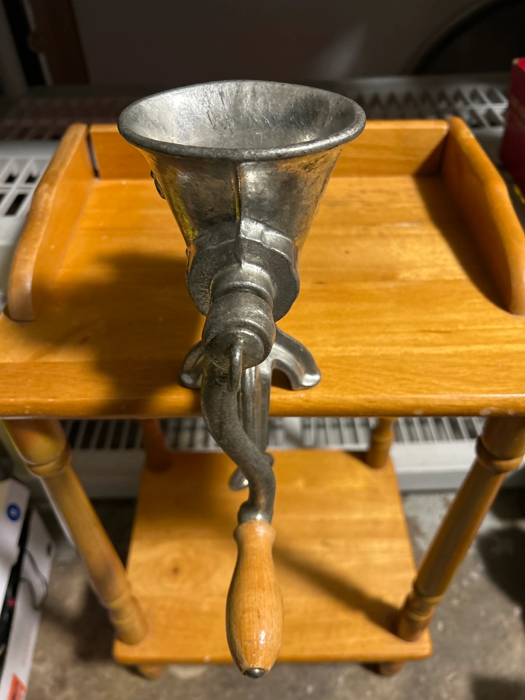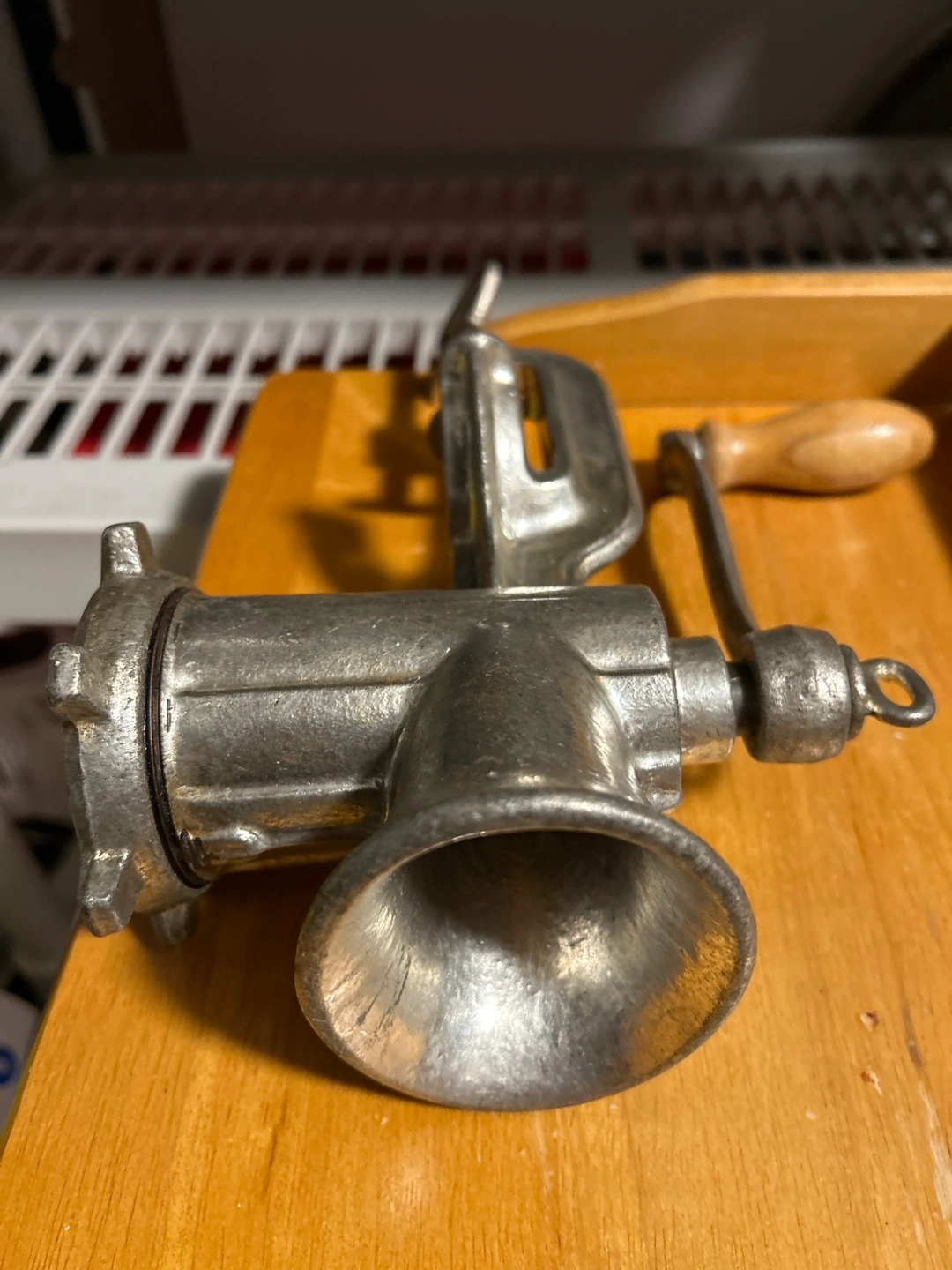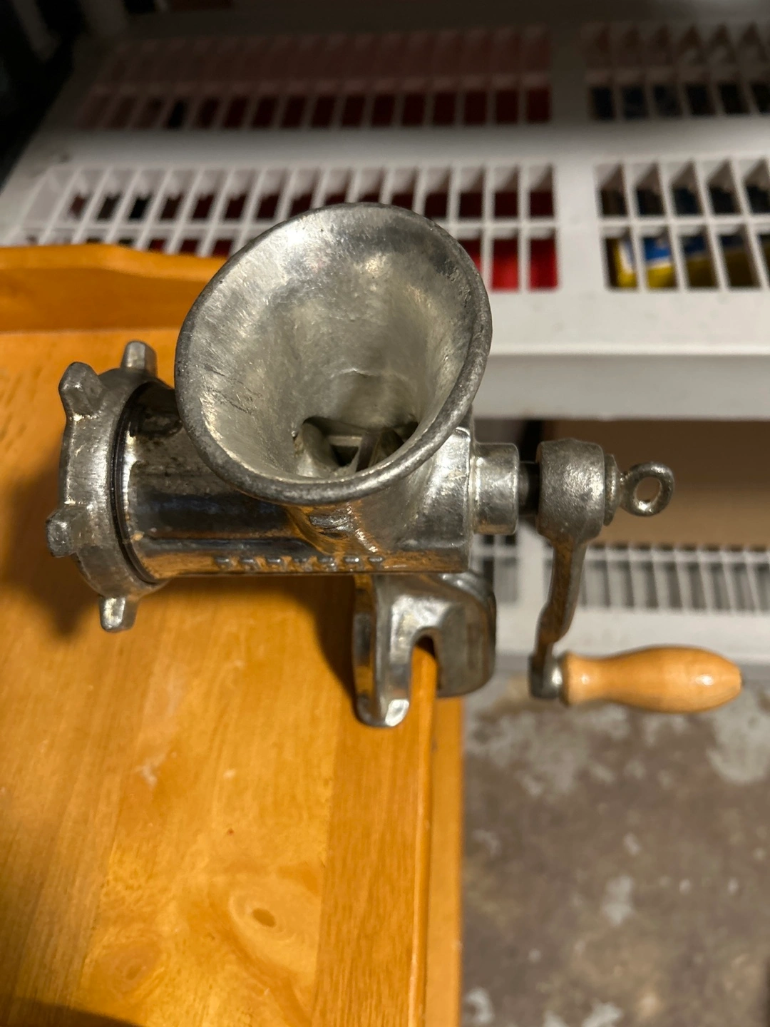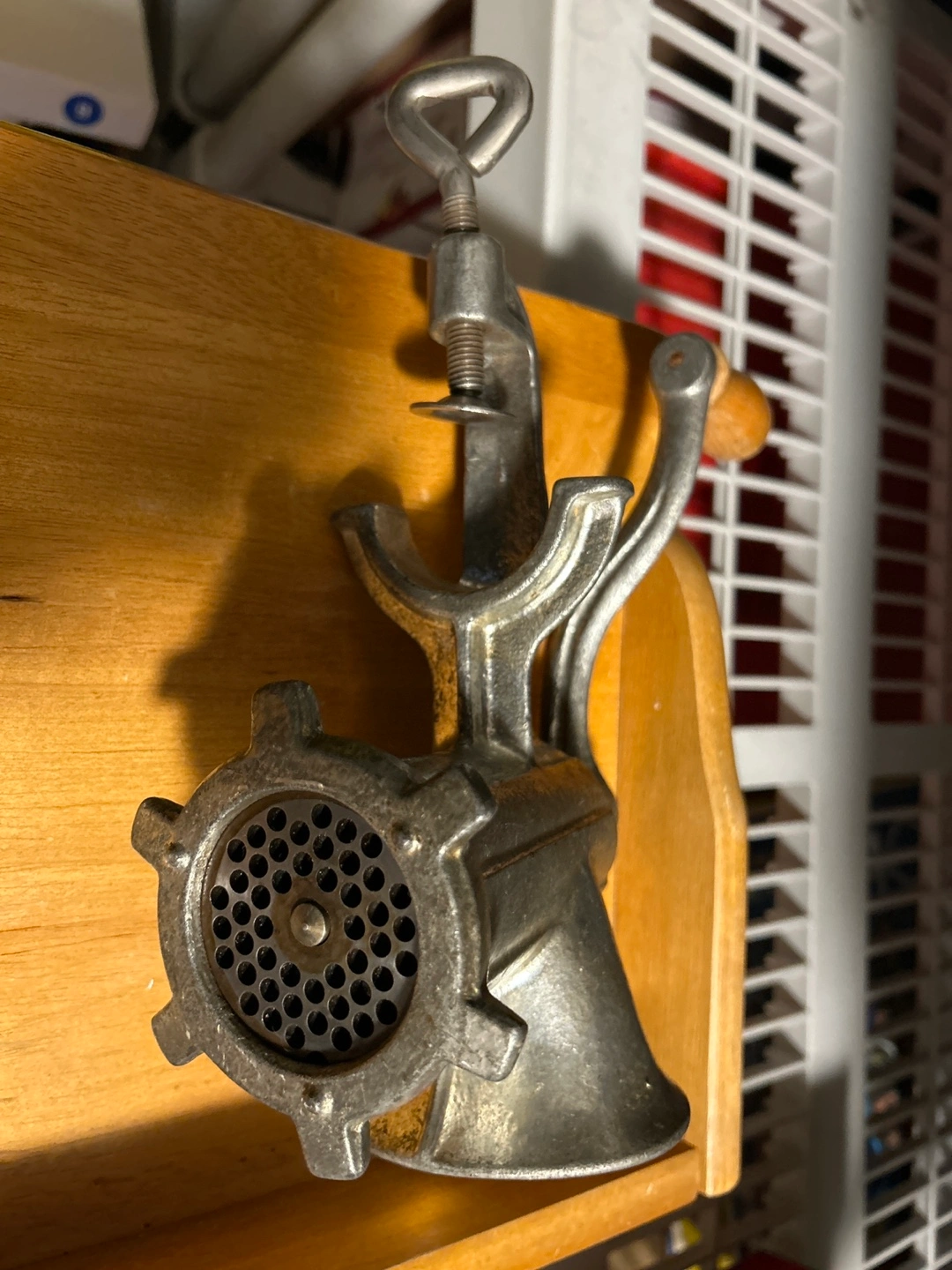 This is a vintage hand crank meat grinder made of metal. It has a wooden handle and clamps securely to a tabletop. It's a durable kitchen tool for grinding meats or making sausages.