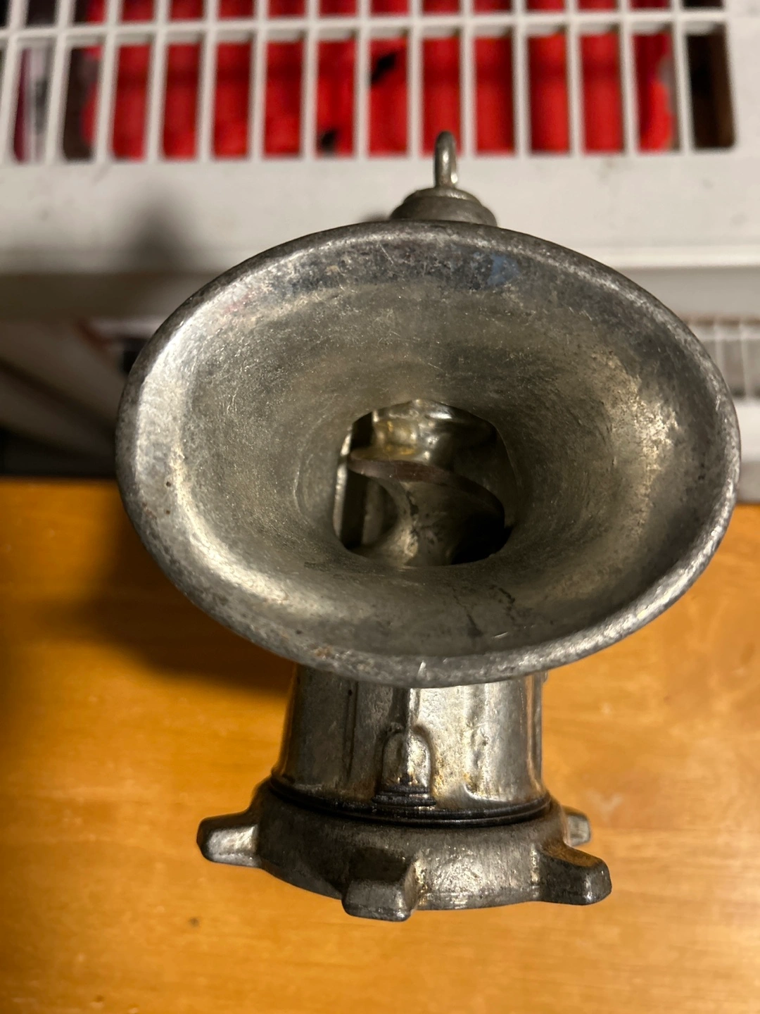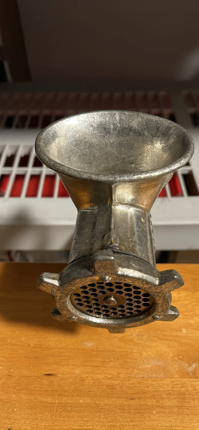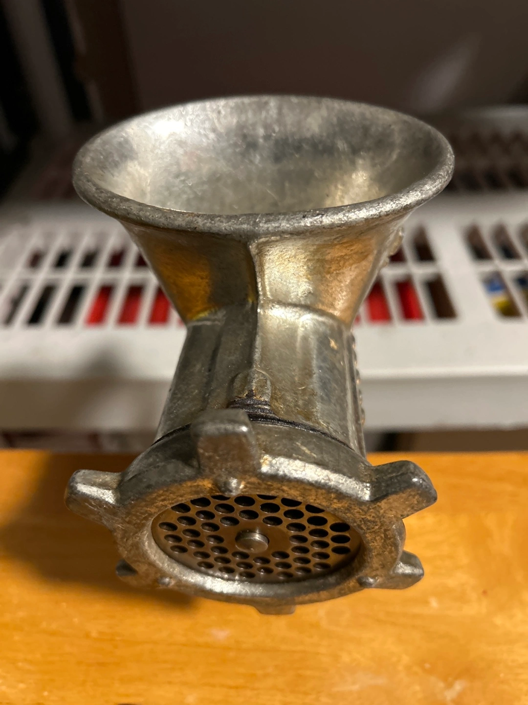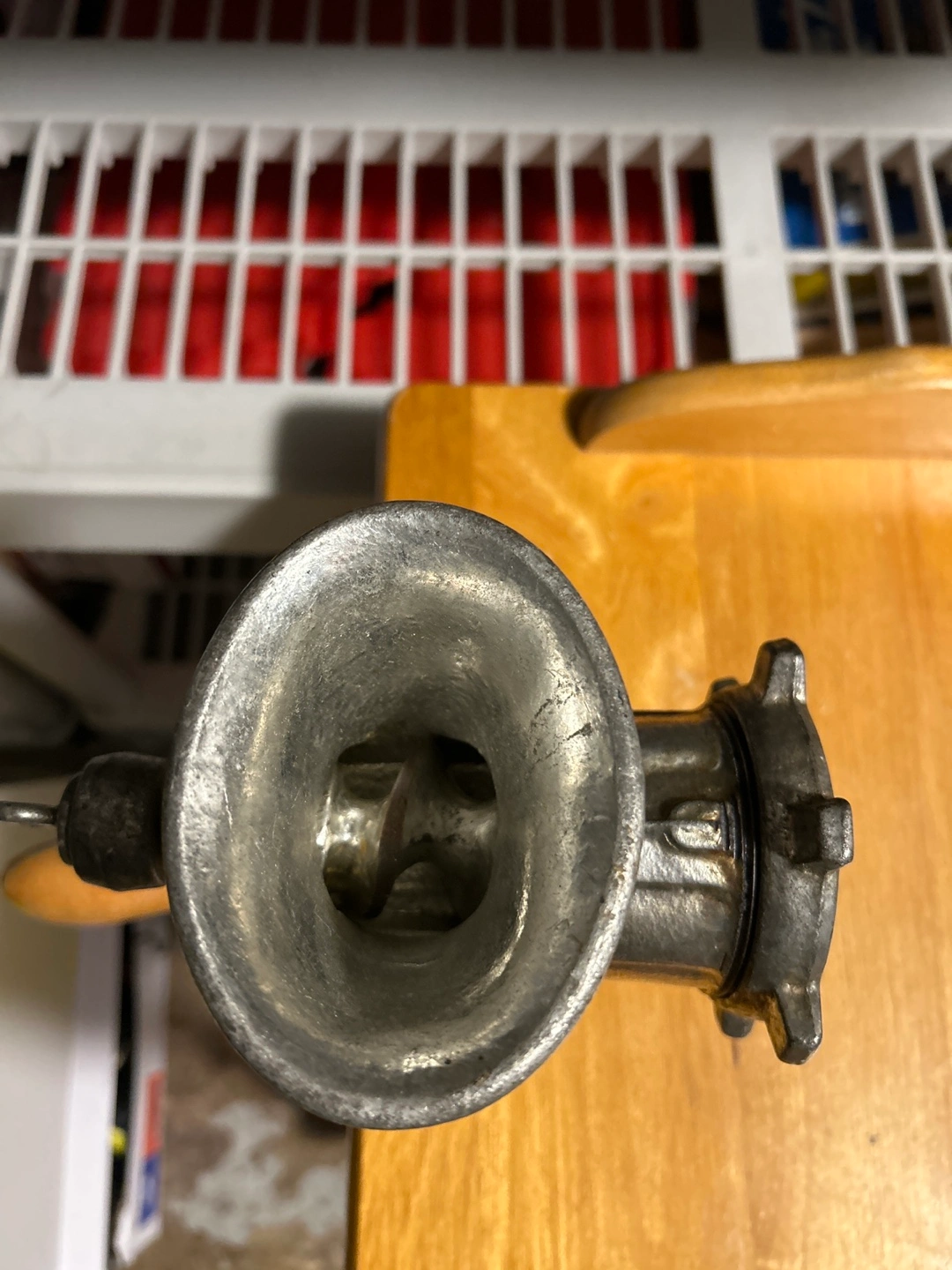 This is a vintage hand crank meat grinder made of metal. It has a wooden handle and clamps securely to a tabletop. It's a durable kitchen tool for grinding meats or making sausages.