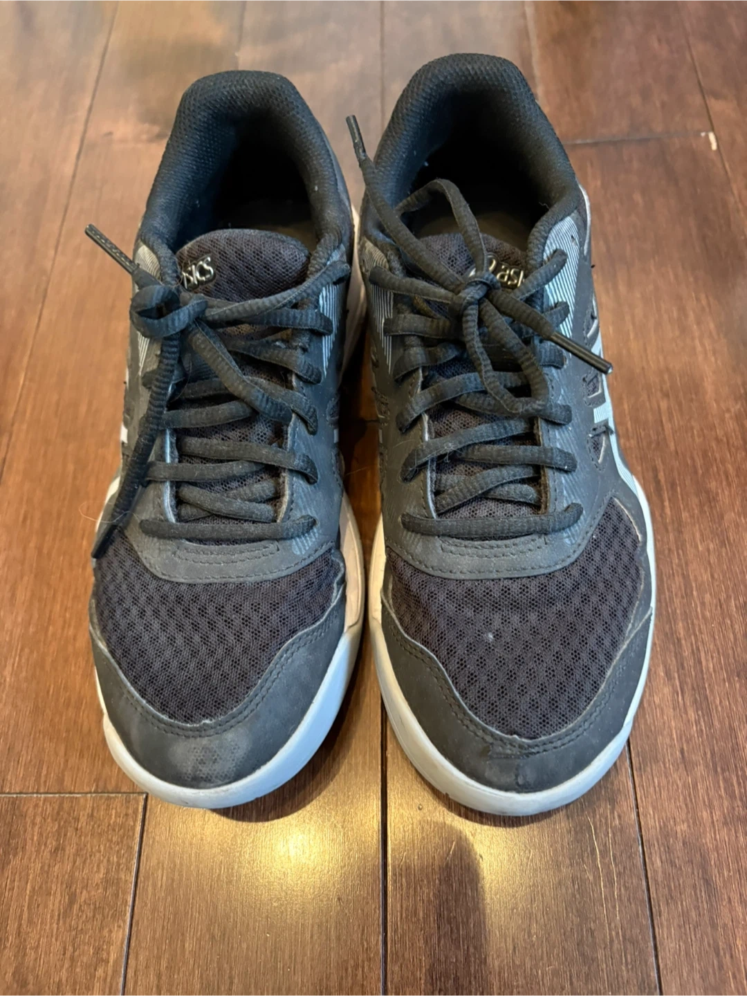 These are Asics running shoes in black and grey. They're made with a mesh upper and have a durable sole. These shoes are great for training or everyday wear.