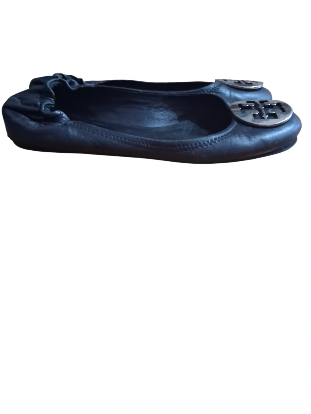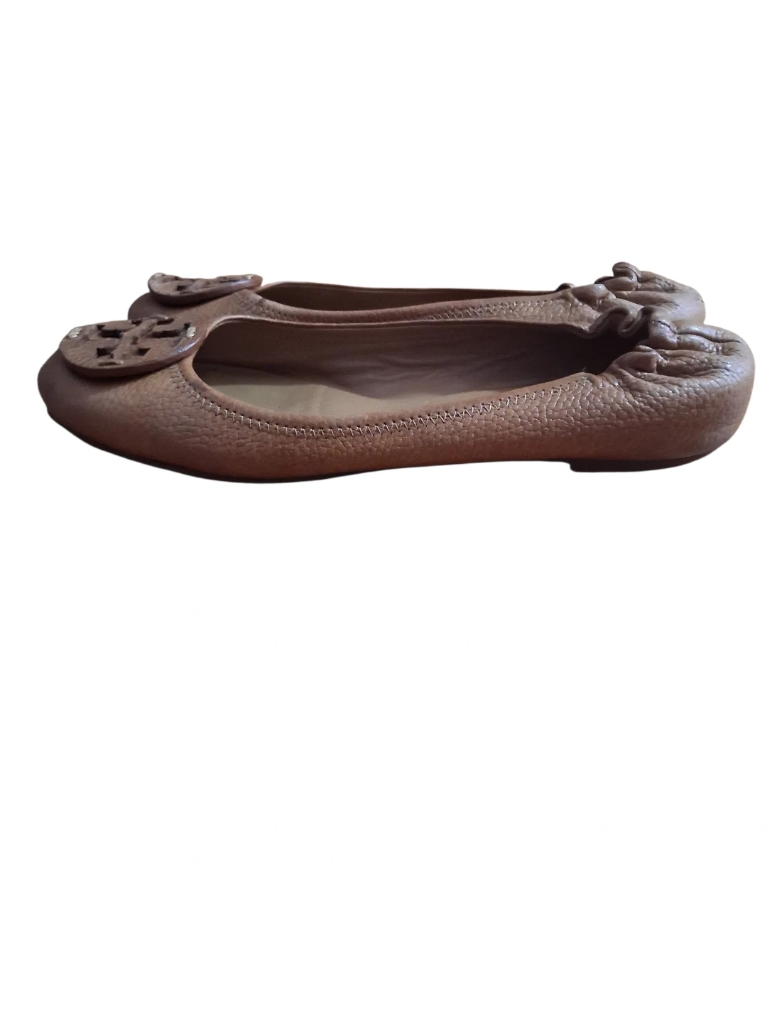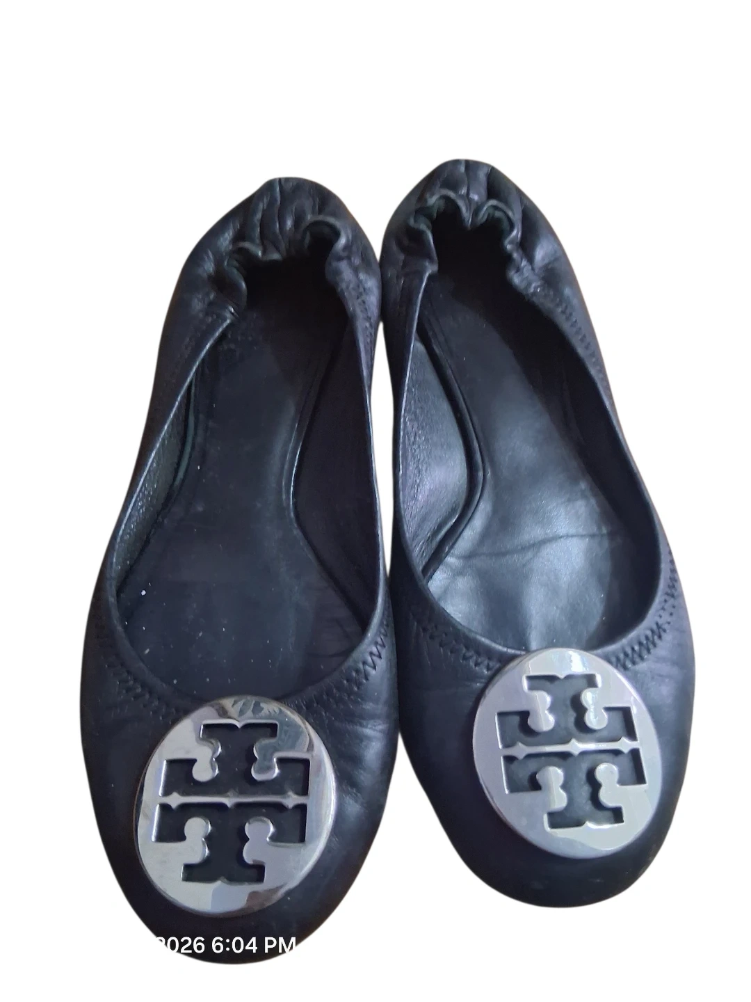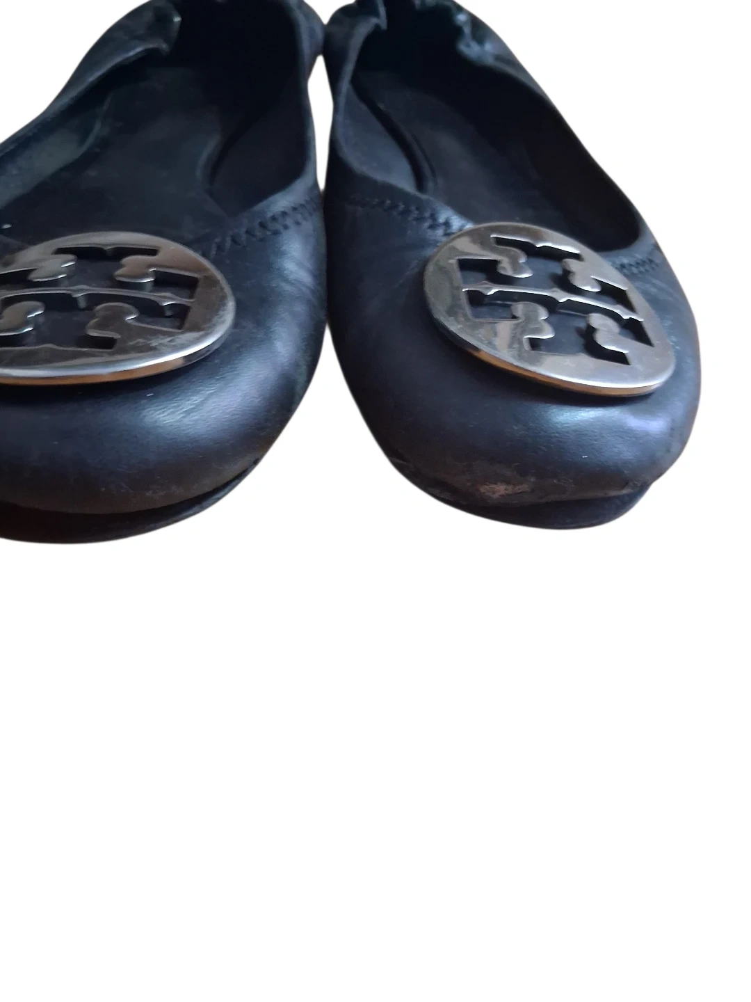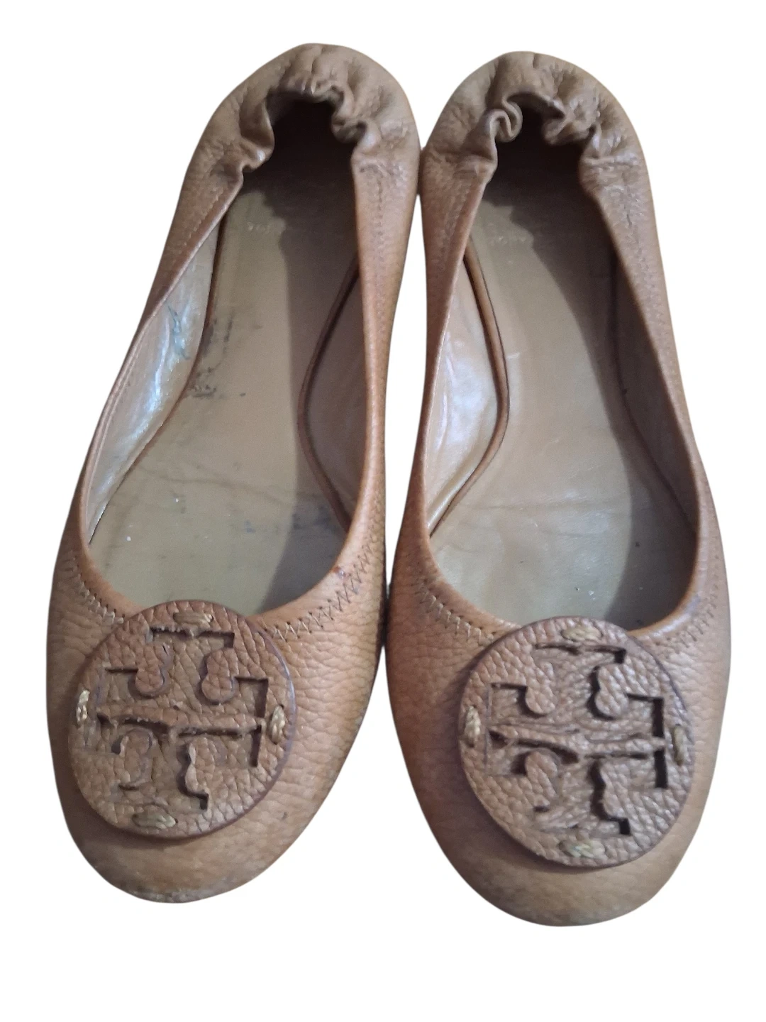 A pair of black and a pair of tan leather Tory Burch ballet flats. Sold together. Features the signature Tory Burch logo. Leather upper and lining. Slip-on style.