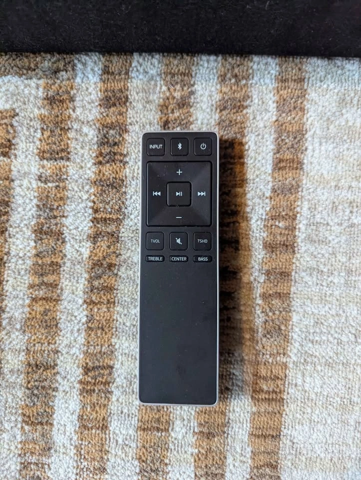 The VIZIO soundbar comes with a power cable and remote control (remote batteries not included).