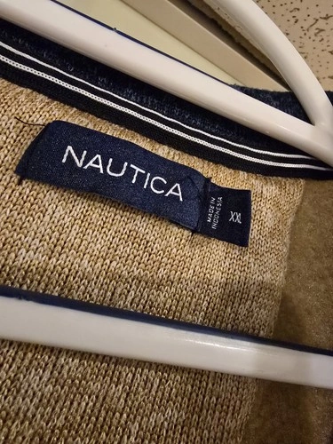 Men's Nautica Quarter Zip Sweater in tan navy color, size XXL. Pullover style, made in Indonesia. A stylish and comfortable option for staying warm during the colder months.
