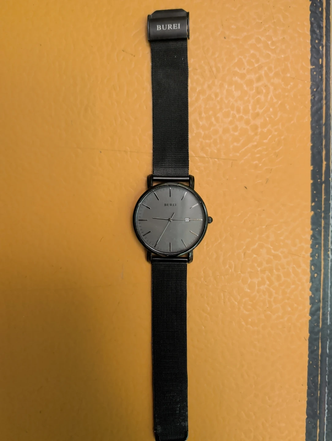 This is a BUREI watch with a sleek black mesh band. It features a simple dial with hour markers and a convenient date window. Stainless steel back, quartz movement.