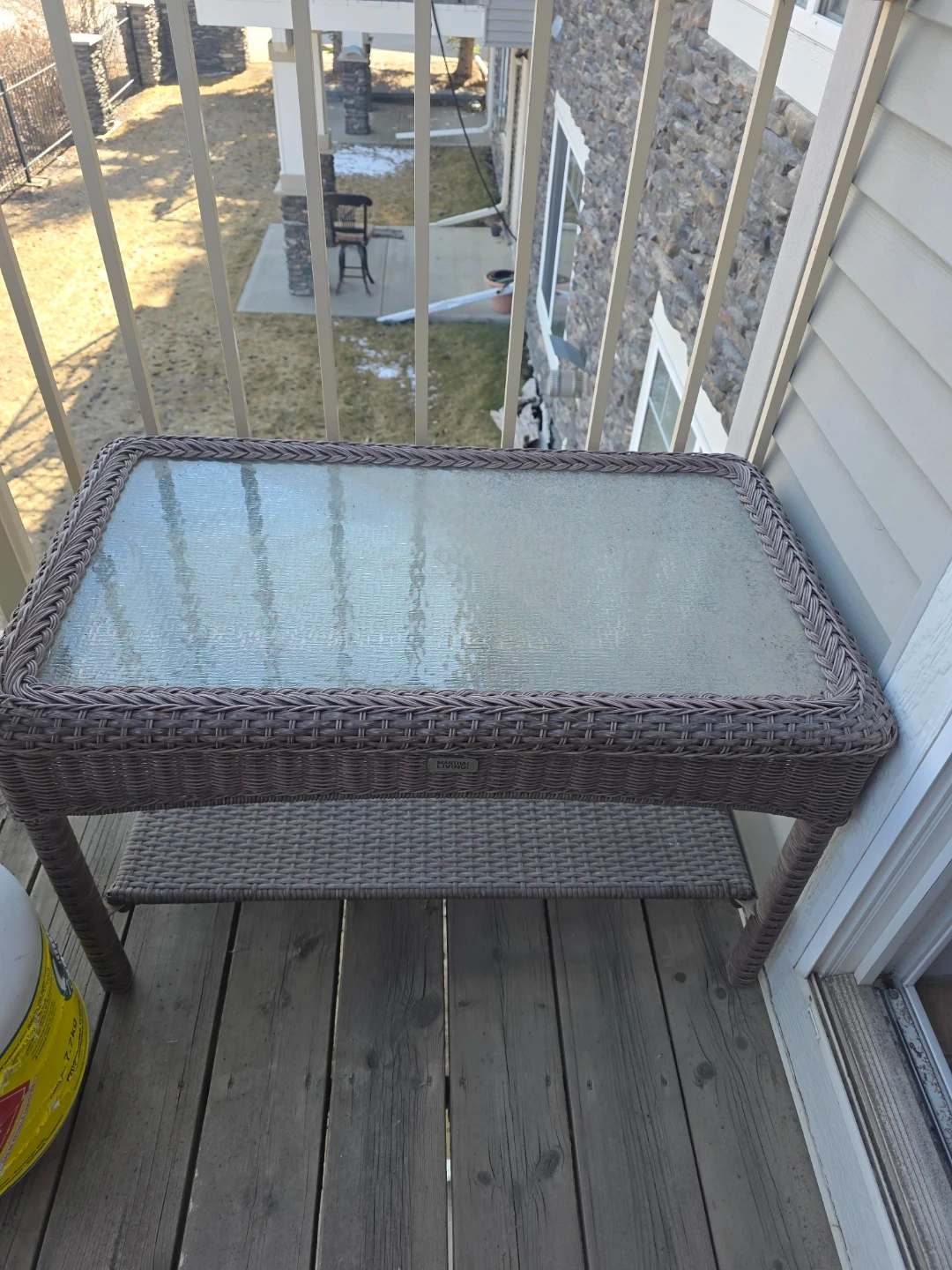 This set includes a wicker armchair with a light green cushion and a matching glass-top side table. The armchair's wicker is a deep brown, and it comes with a separate back cushion. The side table features a shelf beneath the glass top, perfect for outdoor relaxation.