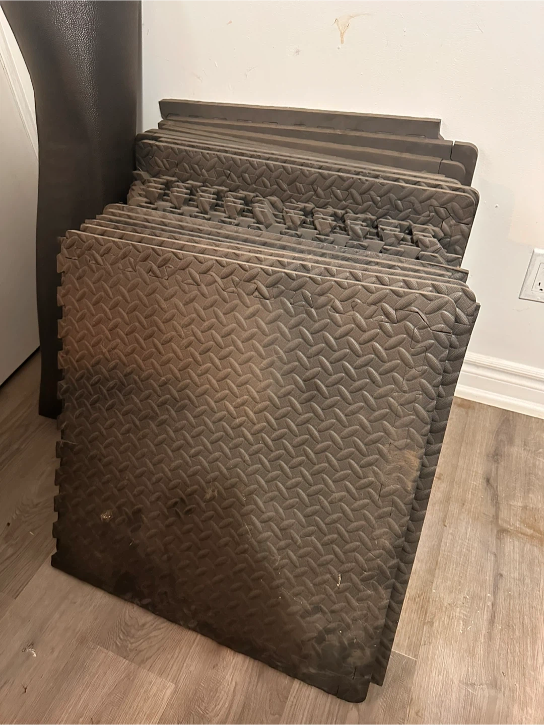 Set of interlocking foam floor mats with a diamond plate texture. 24x24”