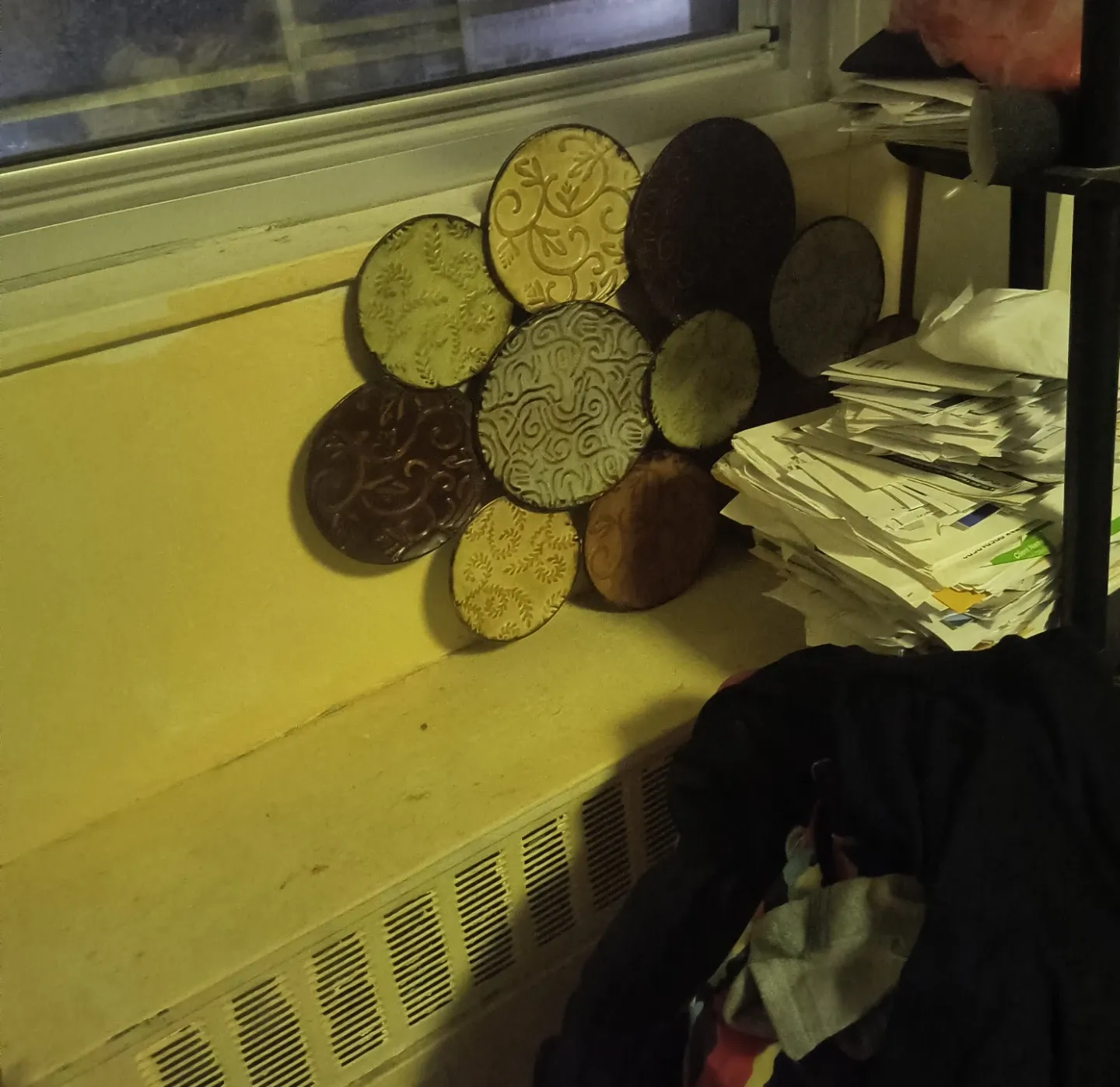 This set includes nine round metal pieces with decorative embossed patterns. Various sizes and colors, including yellow, white, brown, and dark gray. They create a textured mosaic for wall decoration. Perfect for adding a touch of elegance to any room!
