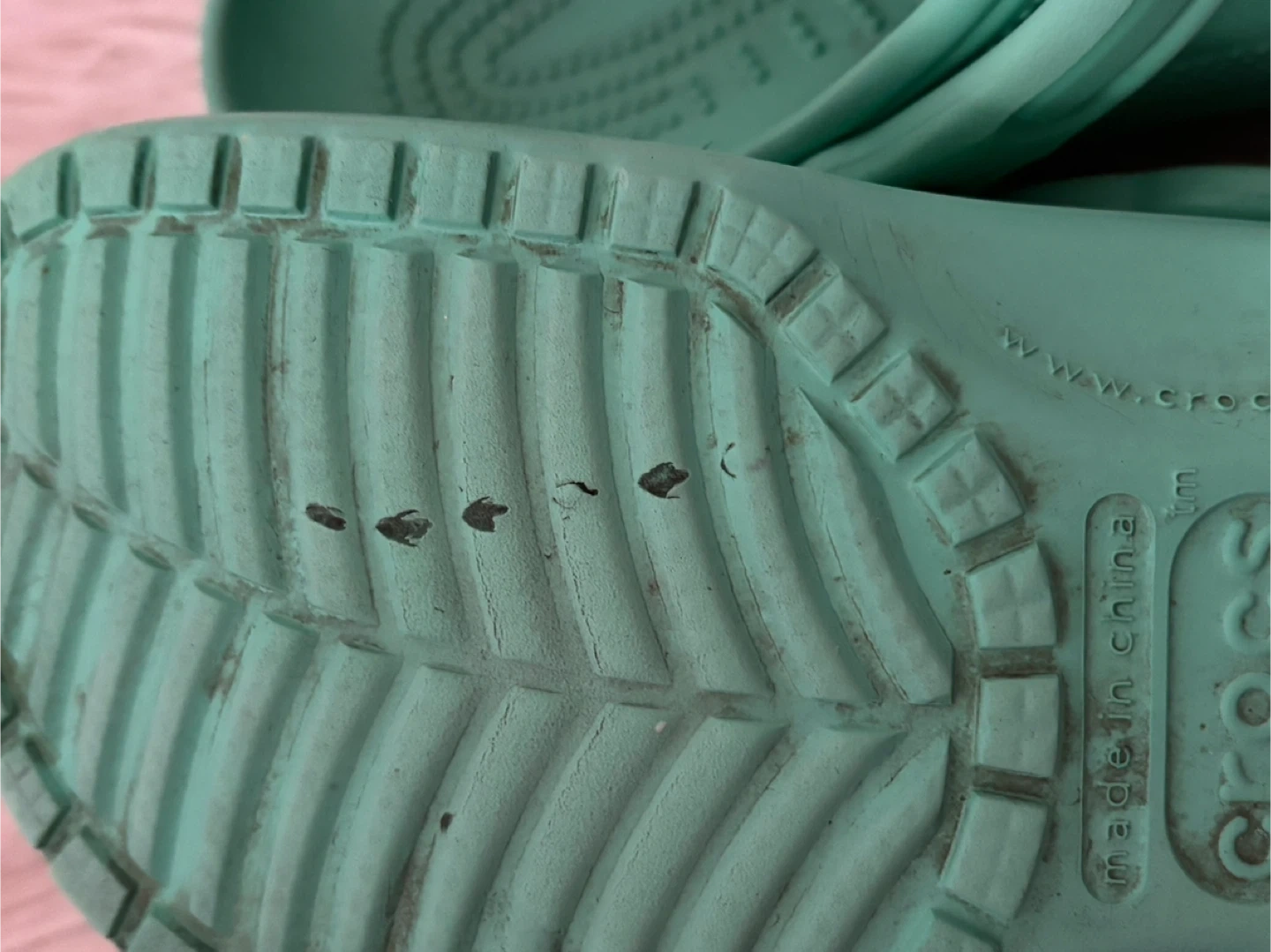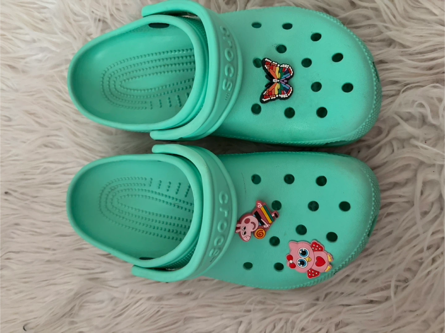 Kids' turquoise Crocs clogs decorated with fun Jibbitz charms including a butterfly and an owl. These shoes are made from Croslite material for comfort and easy cleaning. They're perfect for active kids who love to play outdoors! they are size 4 in mens, 6 in womens