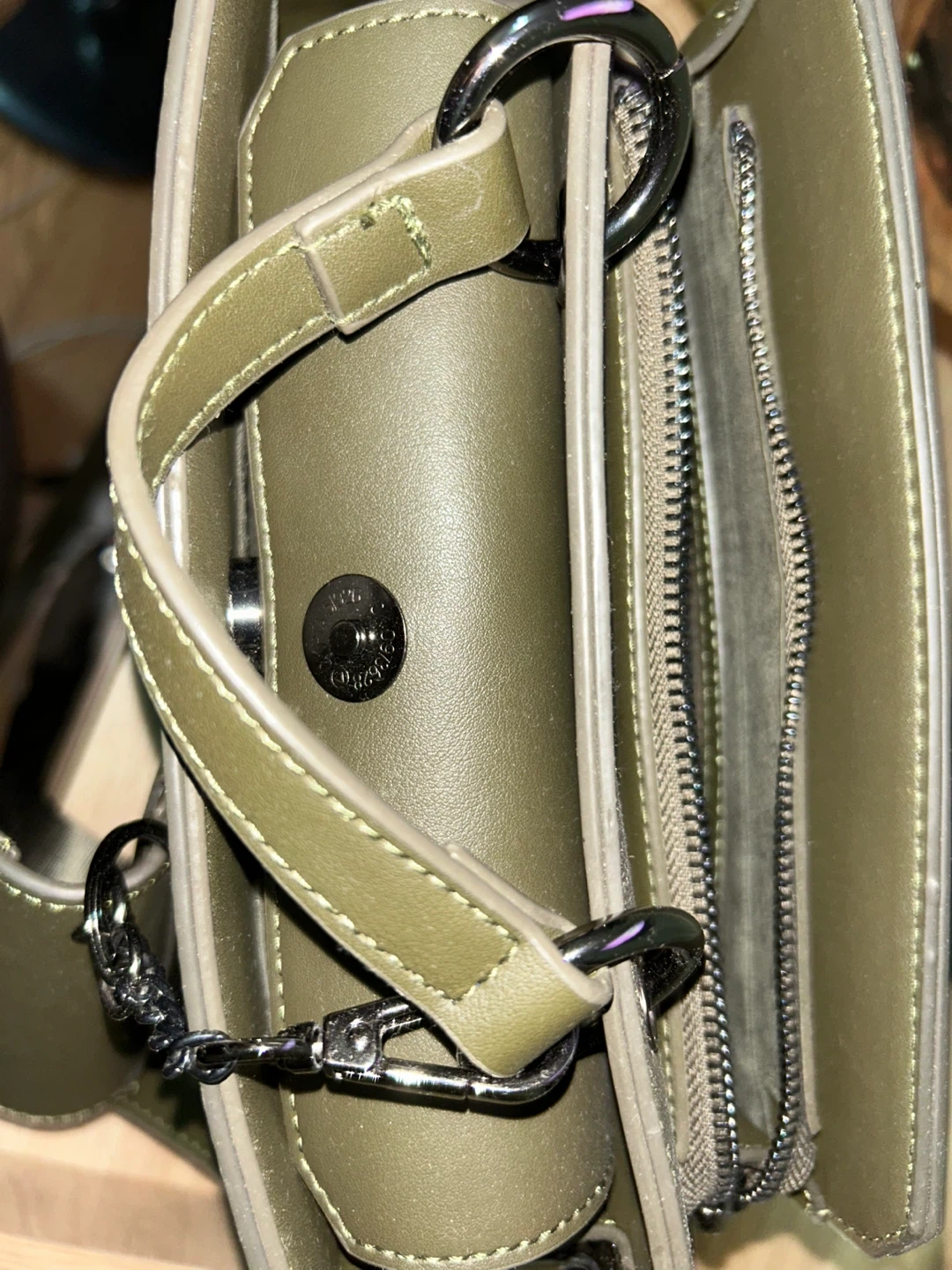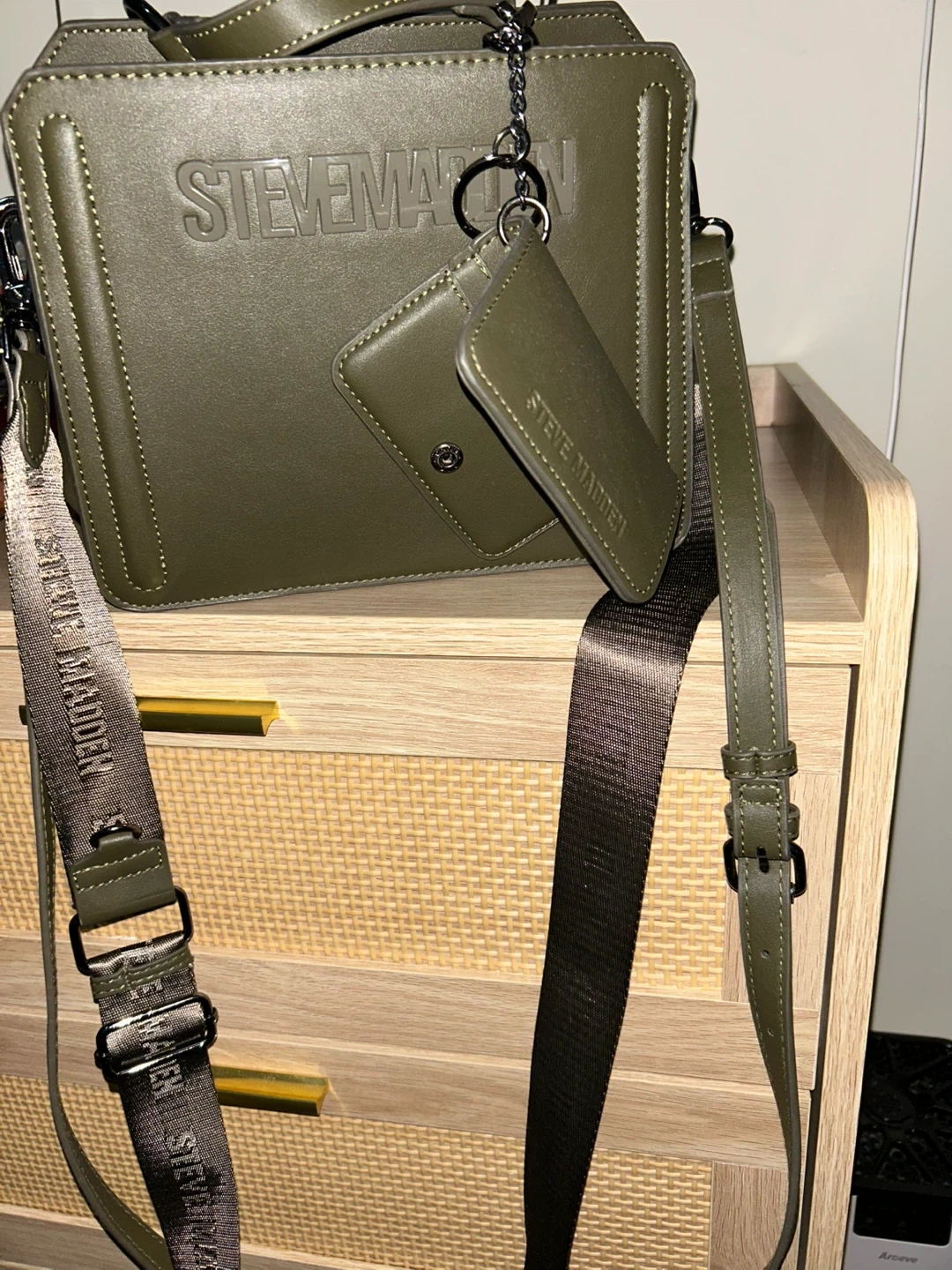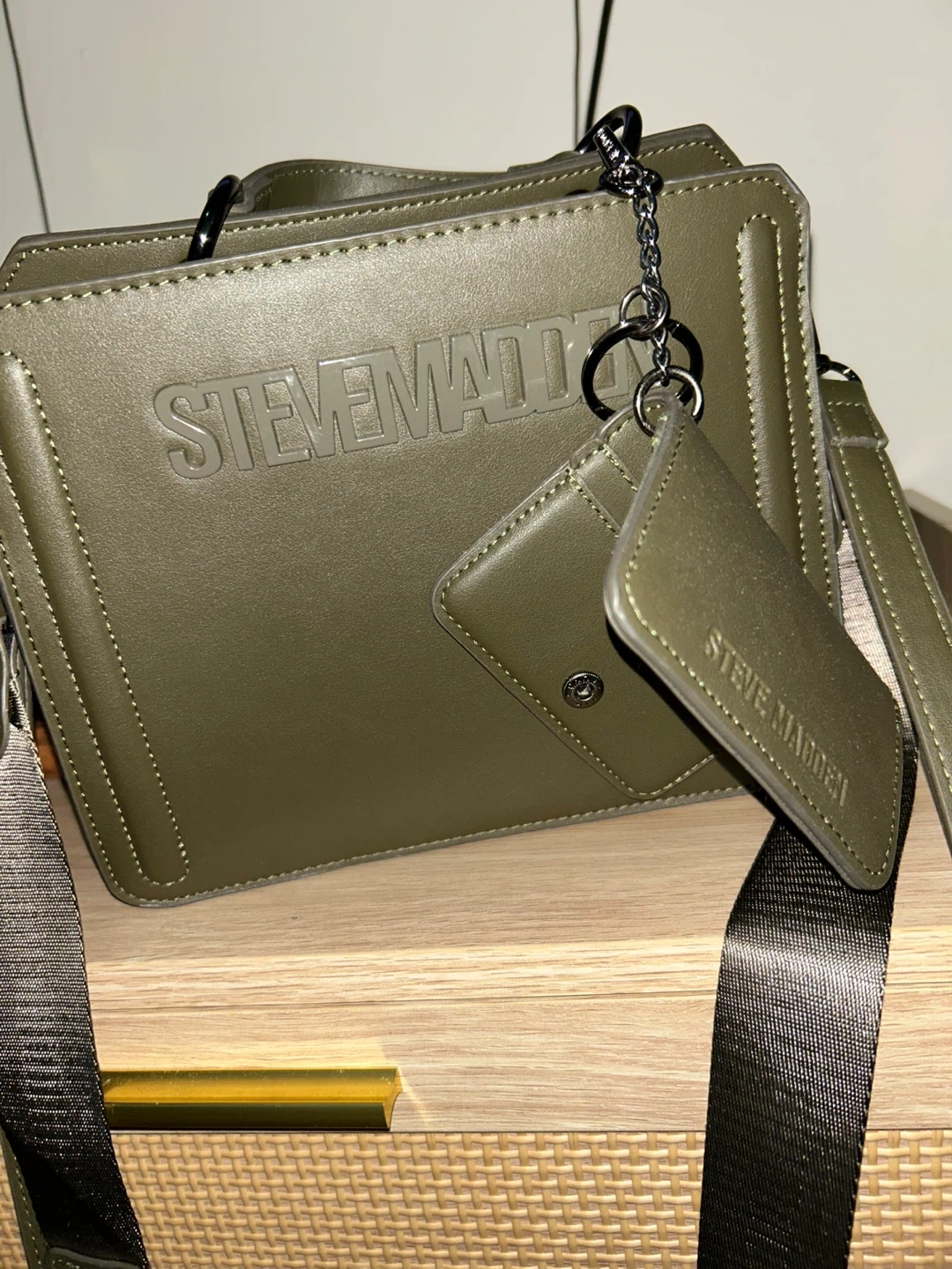 This Steve Madden crossbody bag is in great condition and ready for a new owner! It's a stylish olive green color, perfect for everyday use. The bag features a detachable card holder and adjustable straps. It has both a zipper and a snap closure. i only take out the price