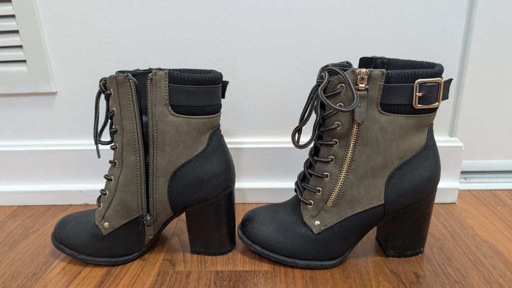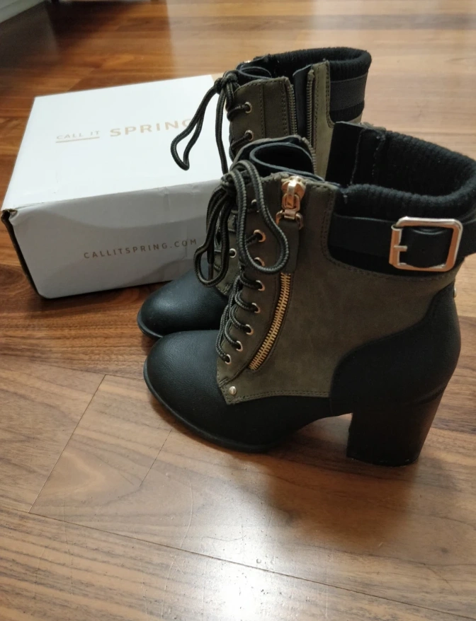 Green and black ankle boots with a block heel, a lace up front, and side zippers. Gold zipper detail on the side for aesthetics only, green zipper is functional. Size 6.