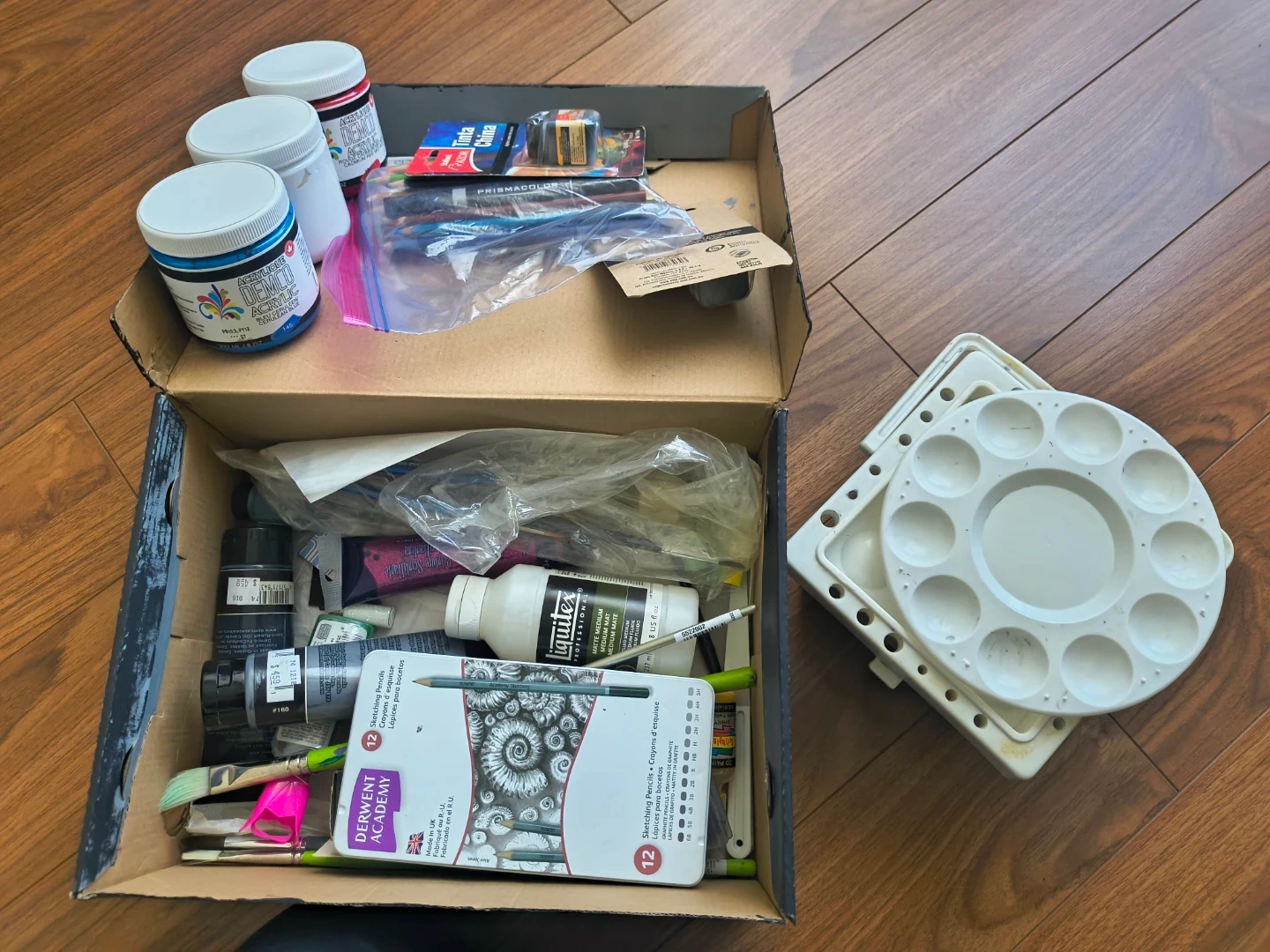 A carrying case and a box full of various art supplies including: