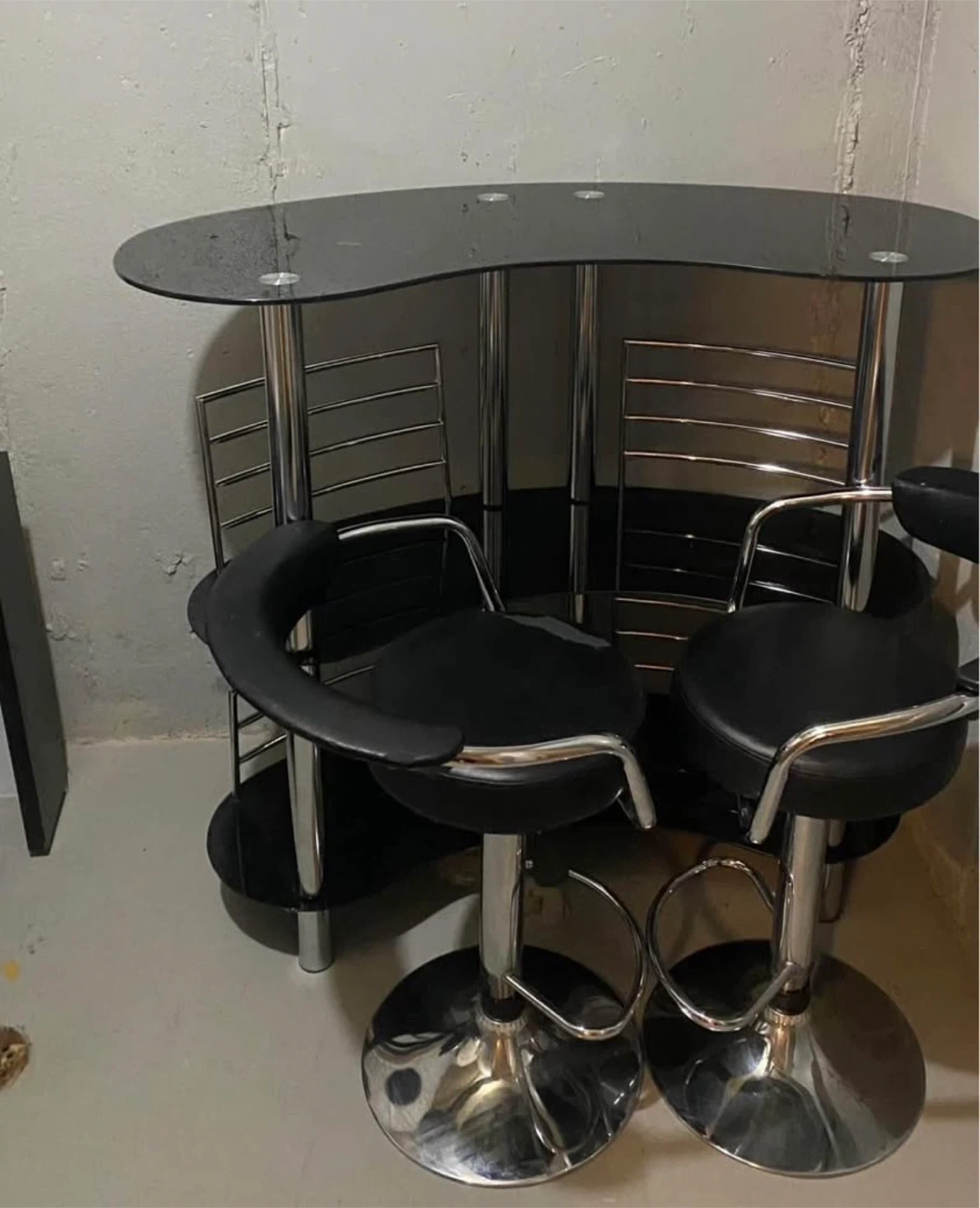Selling a bar table with two swivel chairs. The table has a black glass top and chrome accents. The chairs are black with chrome bases. Great for a small space or adding a touch of style to your home!