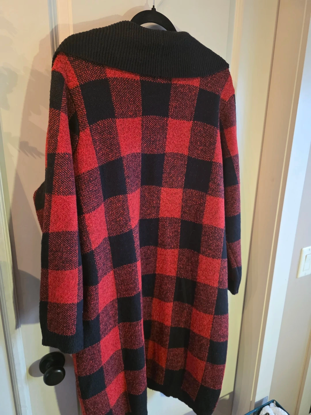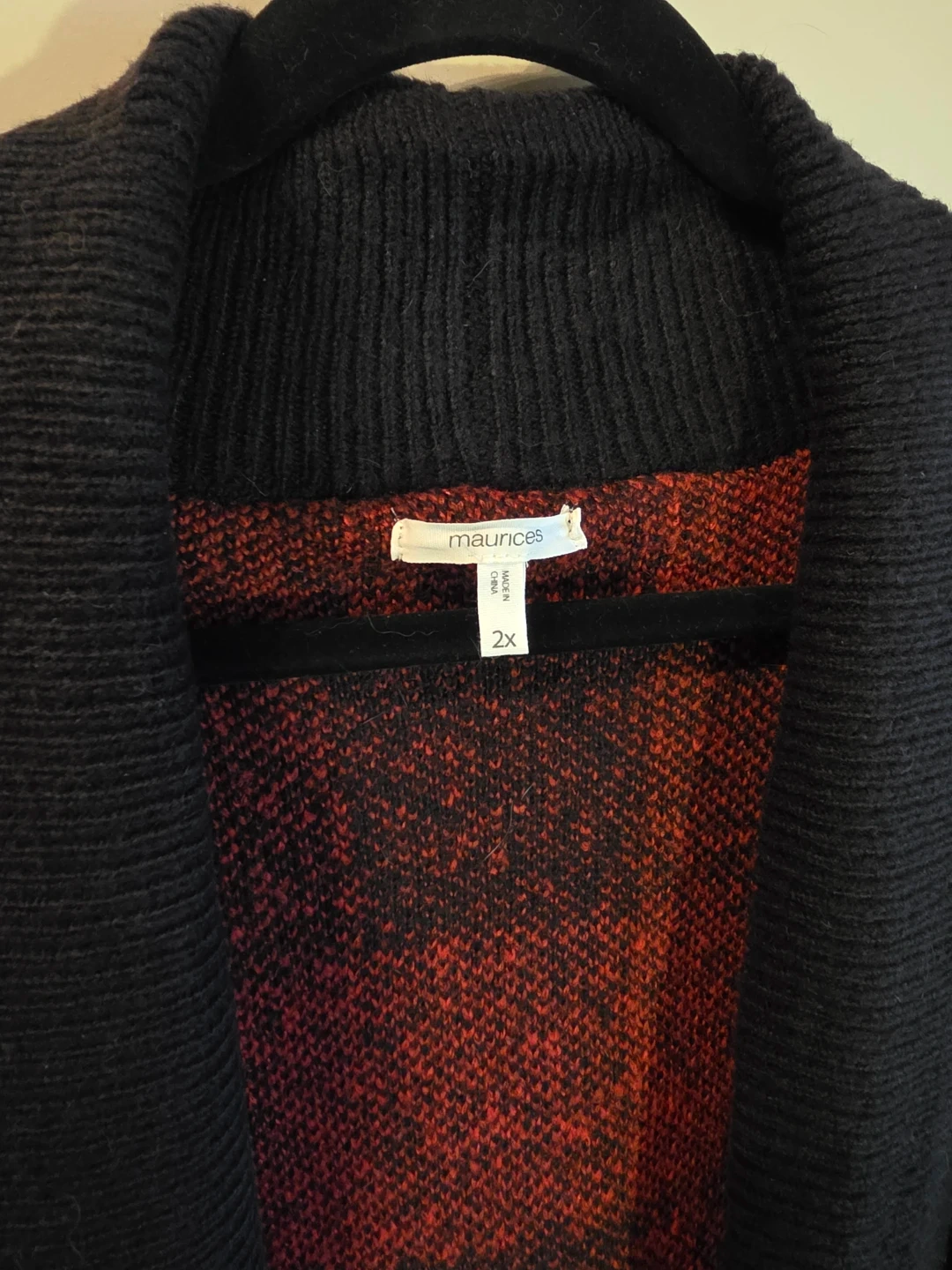 This is a cozy, longline cardigan sweater from Maurices. It's a size 2X and features a classic red and black buffalo plaid pattern. Two front pockets add extra convenience!