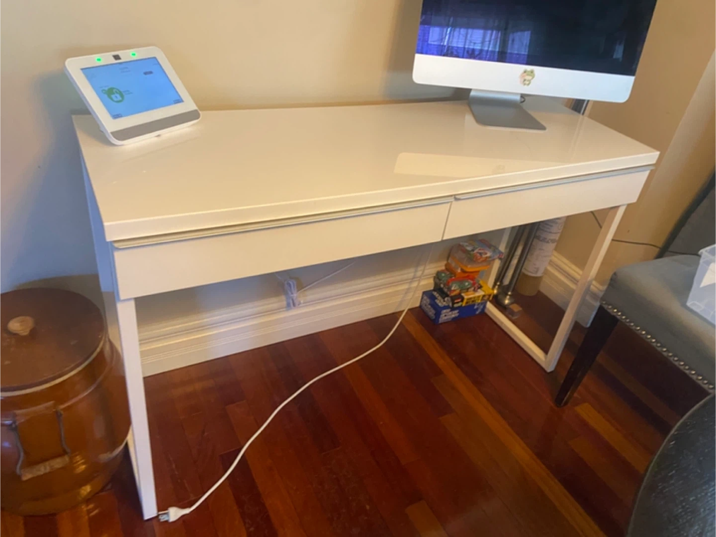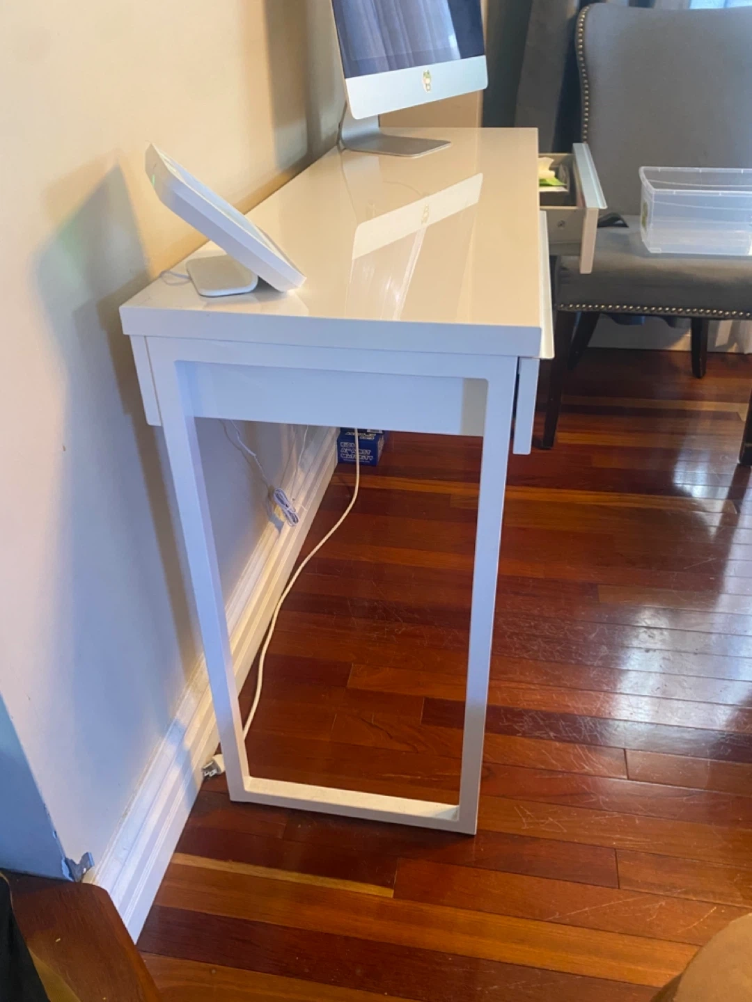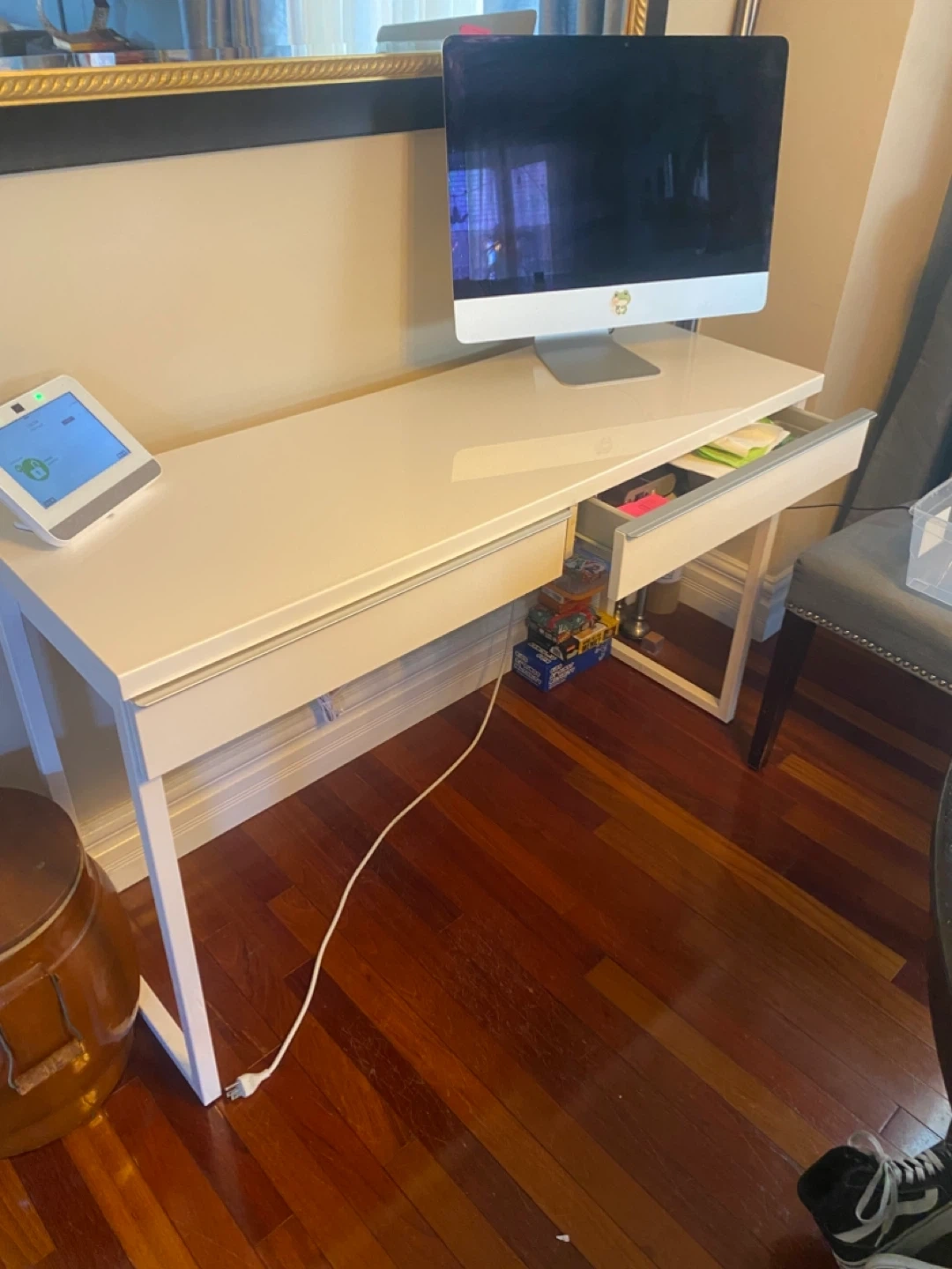 A sleek white modern desk featuring two drawers for storage. It's perfect for a home office or study space. This desk offers a clean aesthetic and functional storage. Easy to wipe down.