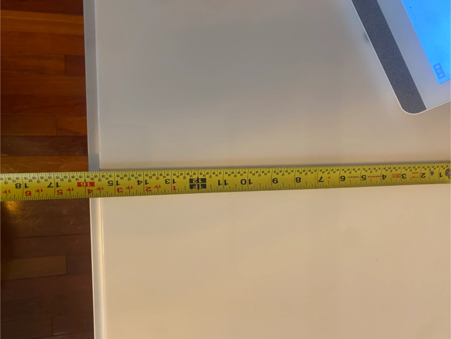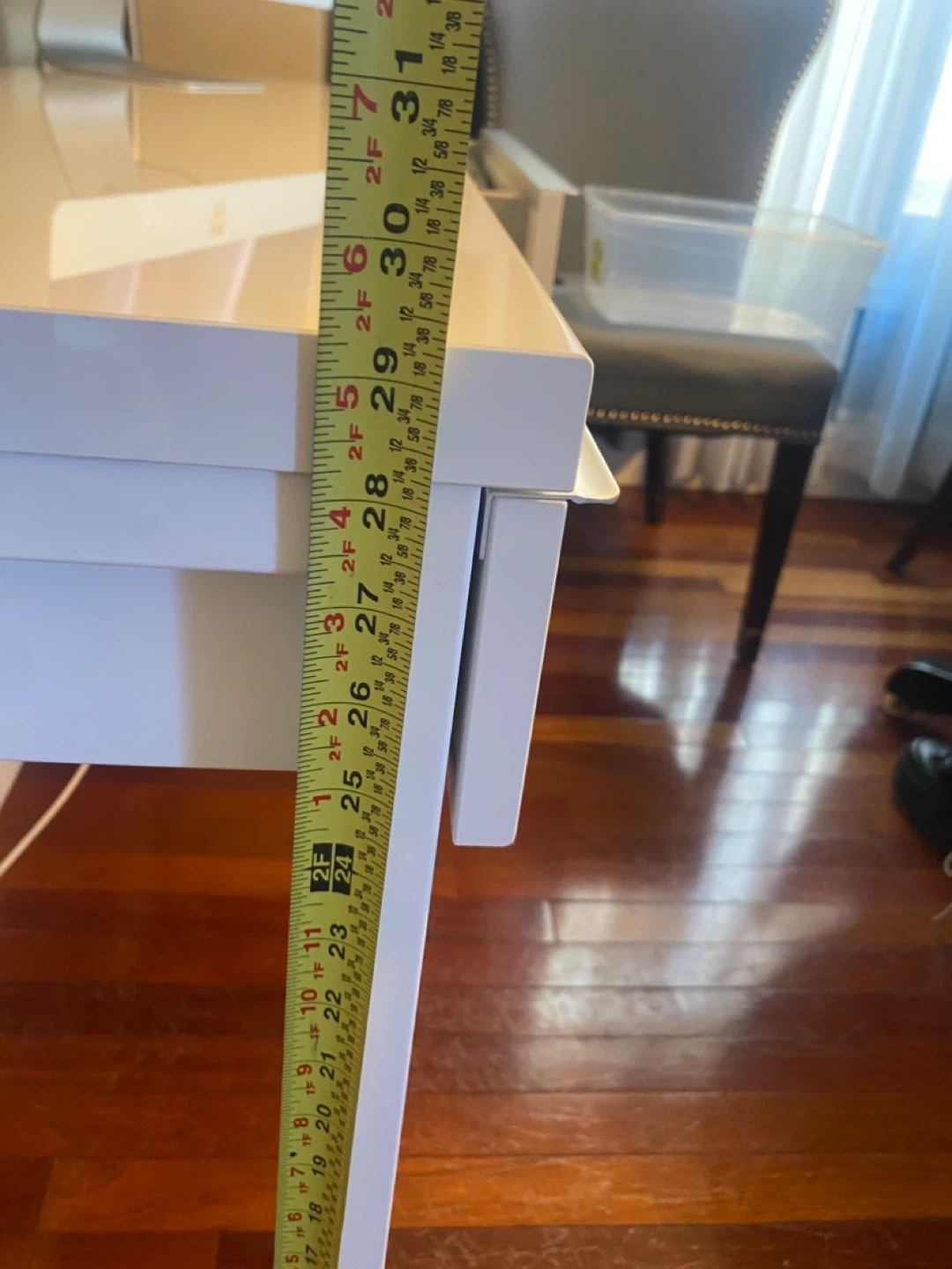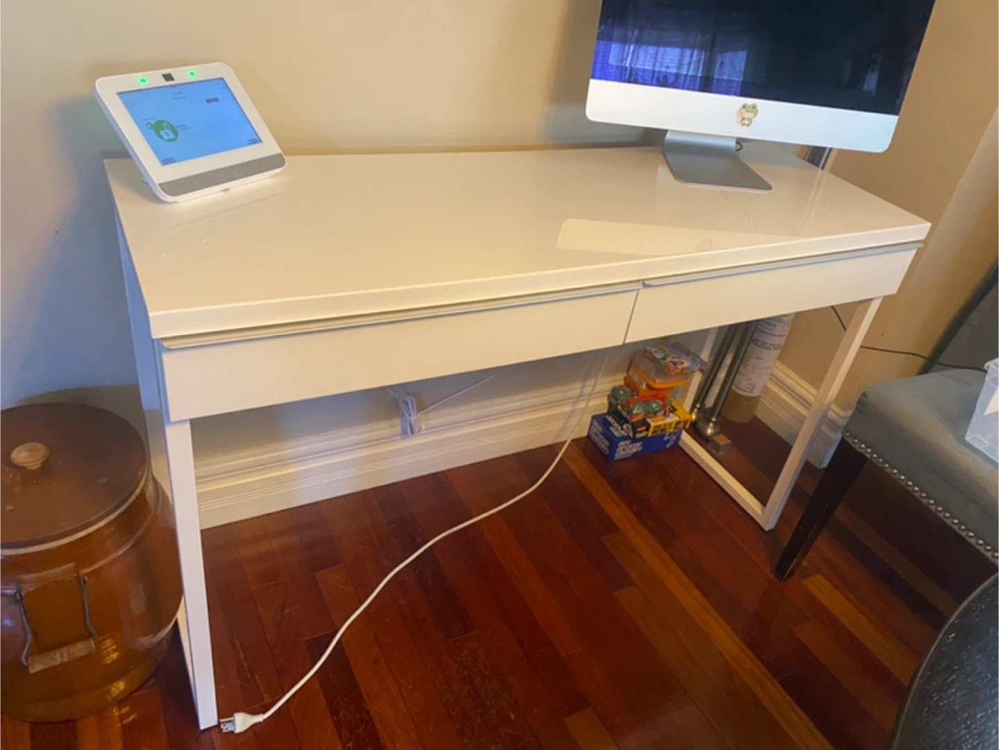 A sleek white modern desk featuring two drawers for storage. It's perfect for a home office or study space. This desk offers a clean aesthetic and functional storage. Easy to wipe down.