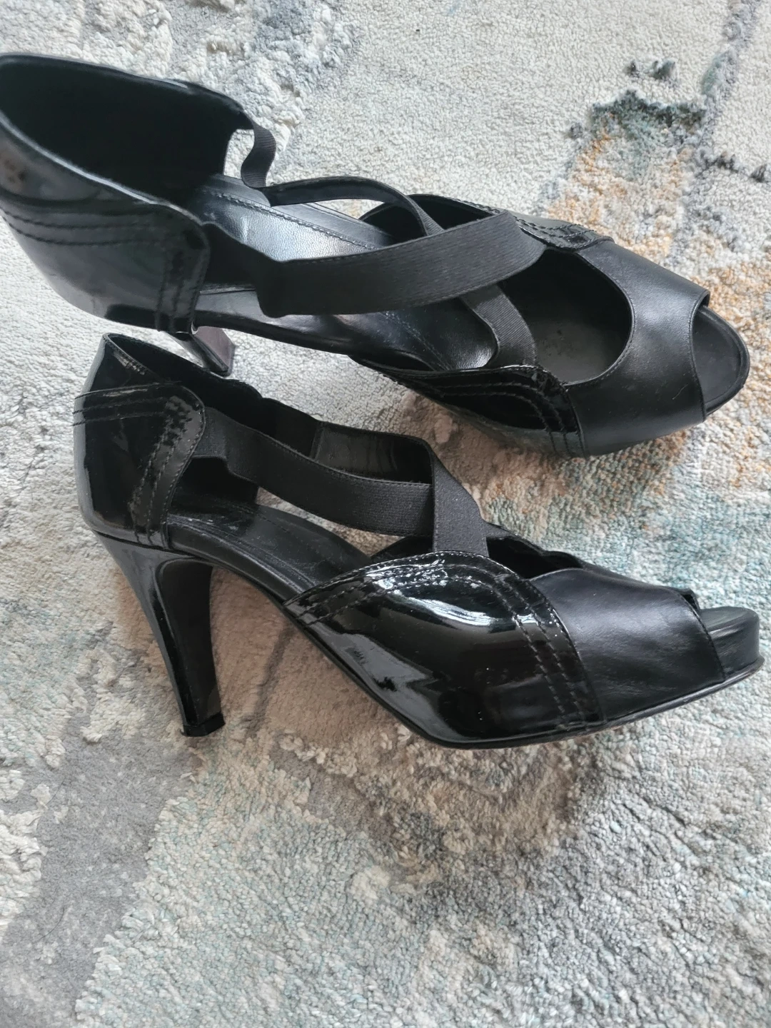 These stylish black peep toe heels are from Dana Davis. Made in Italy, they are a size 10 and feature a comfortable elastic strap design. They've got a sleek patent and leather finish.