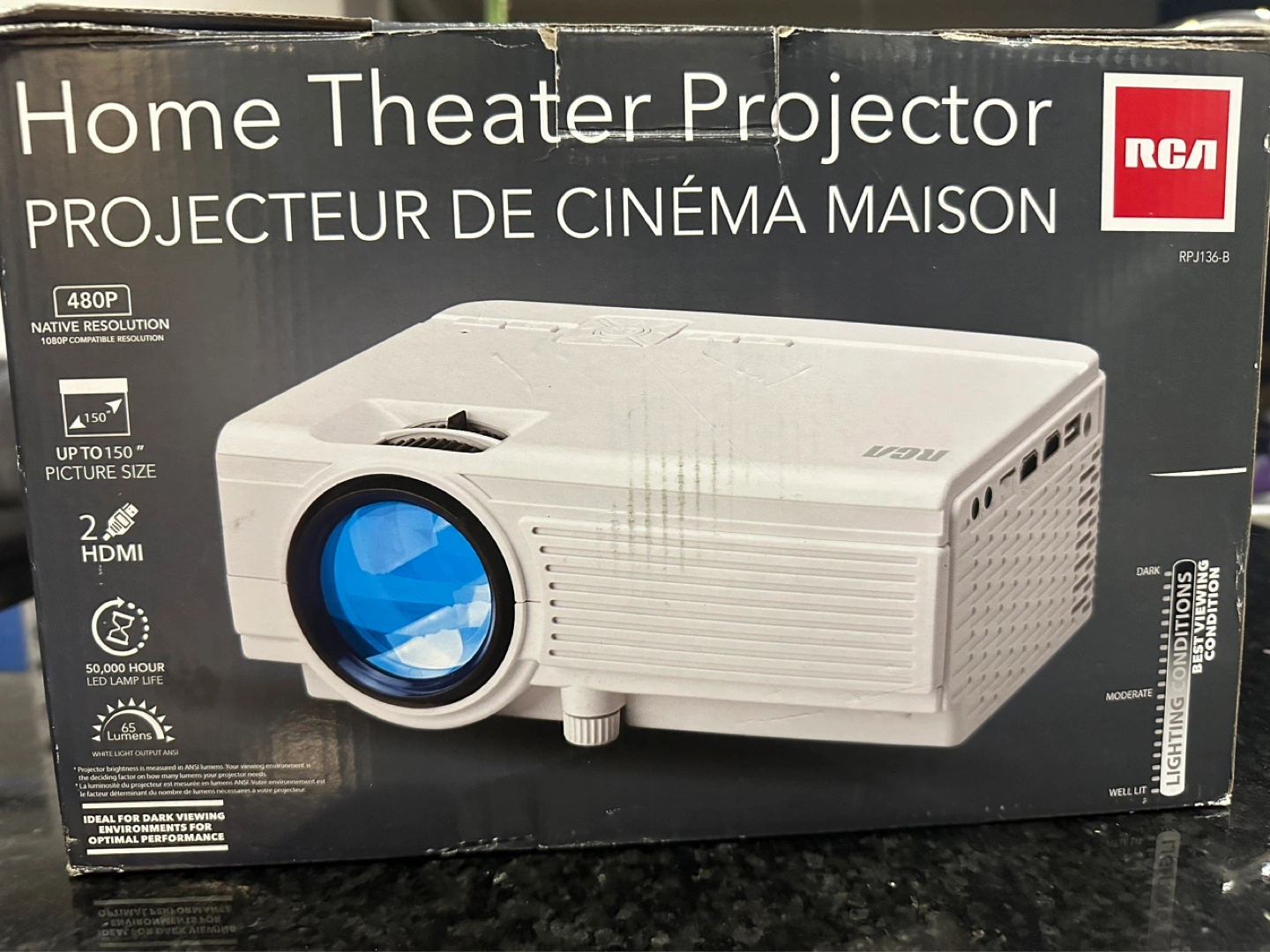Portable projector. 480p native resolution, 1080p compatible. Up to 150" picture size. 2 HDMI ports. 50,000 hour LED lamp life. 65 lumens.